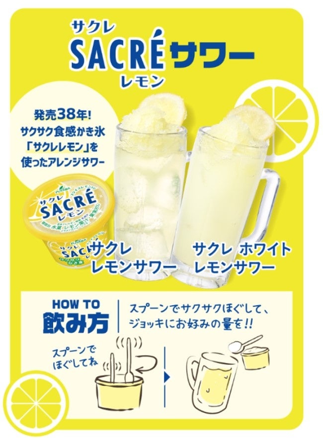 レモンがしっかり感じられる定番の「レモンサワー」と乳酸菌入りですっきりとした甘さの「ホワイトレモンサワー」に、スプーンでほぐしたお好みの量の「サクレ」を入れることで、ワンランクアップした「サクレ レモンサワー」と「サクレ ホワイトレモンサワー」が完成します。