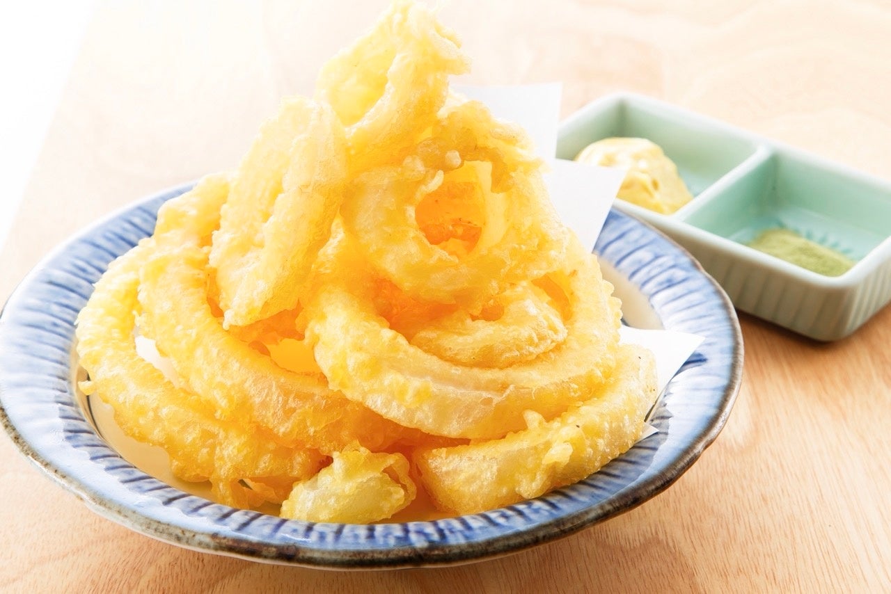 ◆瑞々しい新玉ねぎを高温でサクッと揚げました!抹茶塩とカレーマヨネーズで♪
