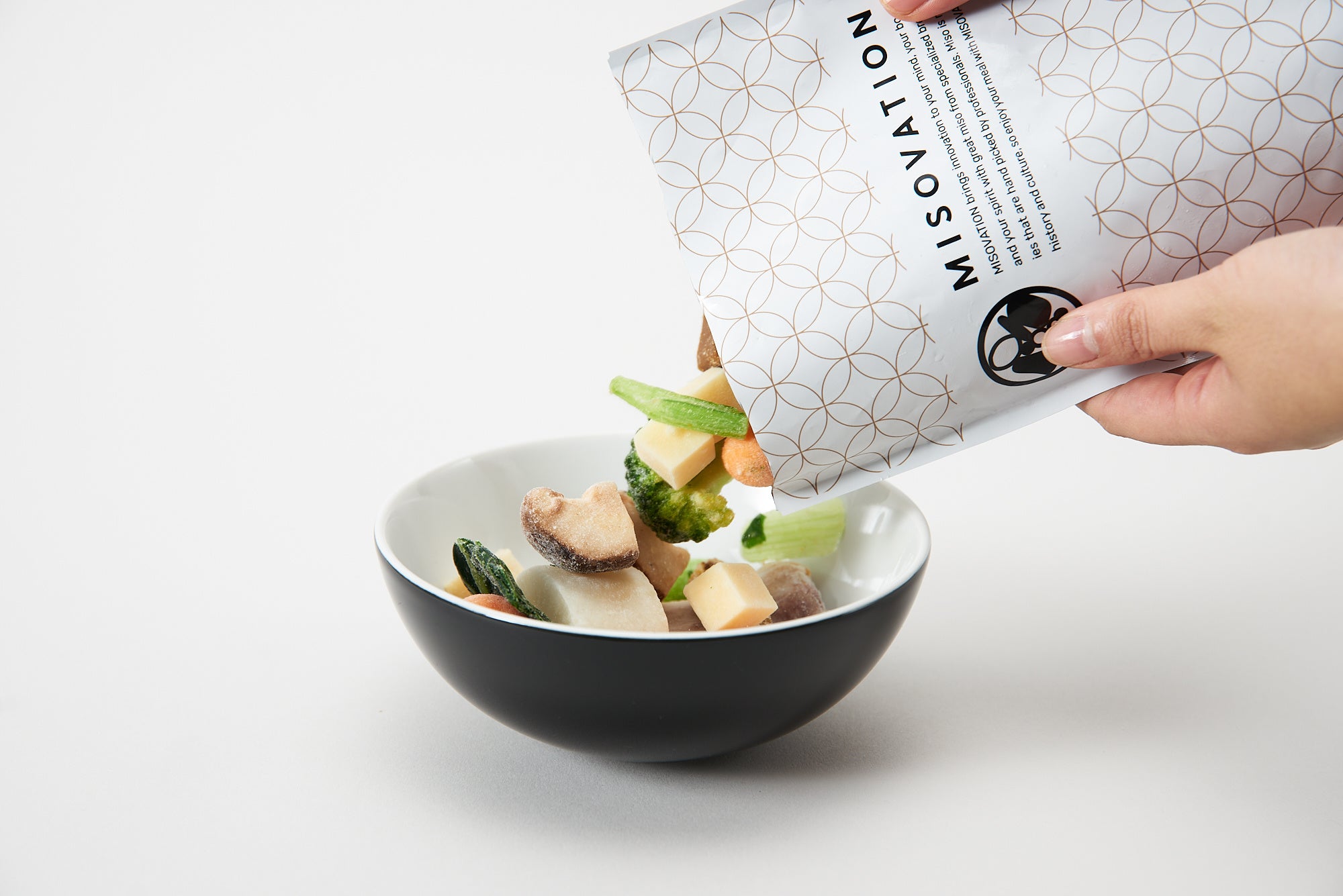MISOVATIONでは豚肉・野菜・味噌などの食材をそのまま瞬間冷凍し、パウチに詰めています。レトルトやフリーズドライではなく、瞬間冷凍だからこそ維持できる「フレッシュな美味しさ」や「加熱に弱い栄養素」を、そのままお届けいたします。