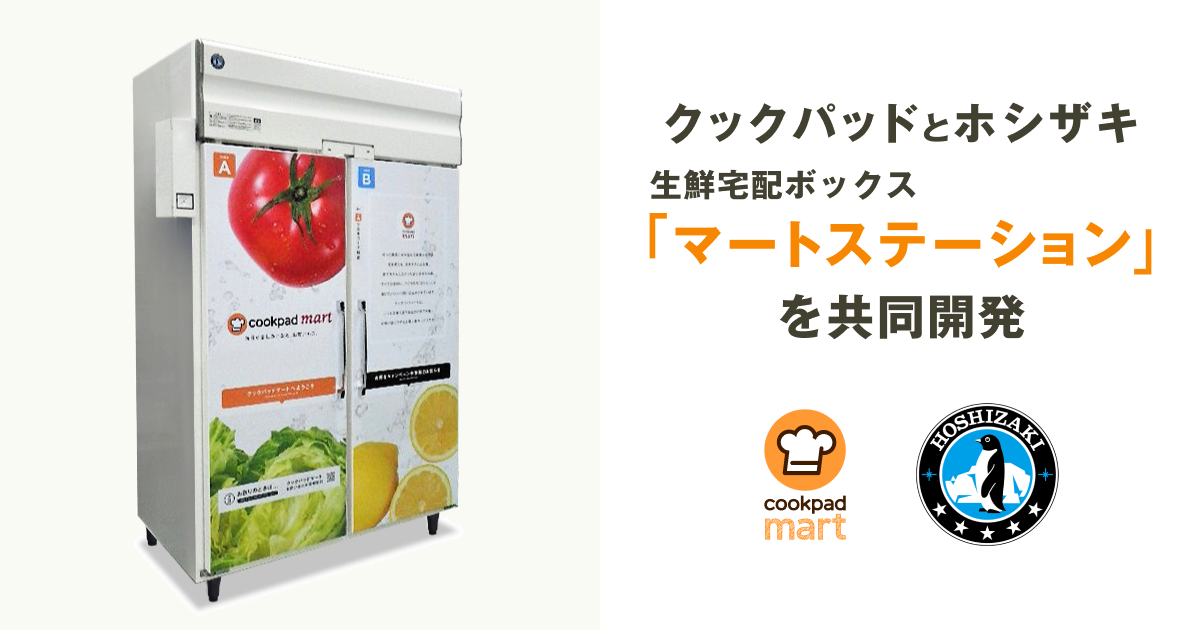 クックパッド株式会社とホシザキ株式会社は、クックパッドが展開する生鮮食品EC「クックパッドマート」の商品受け取り用生鮮宅配ボックス「マートステーション」の新型機を共同開発しました。約1年間の検証期間を経て良好な結果が得られたことから、今後新たに設置が決まった場所を中心に、新型マートステーションの導入を開始します。