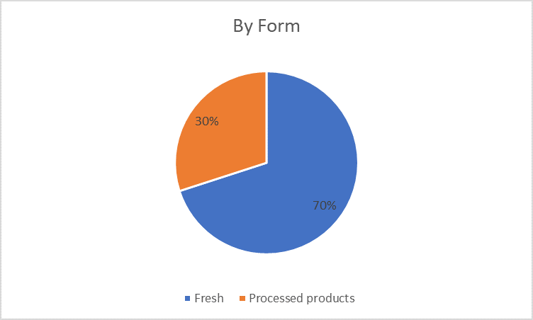 回答: 調査の結果、生鮮食品 (70%) と加工品 (30%) が市場のセグメンテーションを構成していることがわかりました。新鮮なセグメントは、フレーバーと全体的な品質の属性、および多数の健康付与特性により、最大の市場シェアを占めています。