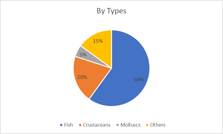 回答: 調査の結果、シーフードの種類は、魚 (60%)、甲殻類 (20%)、軟体動物 (5%)、その他 (15%) であることがわかりました。魚市場は、その多くの健康上の利点により、最大の収益シェアを保持しています。魚やその他の魚をベースにした製品は、家禽に比べてタンパク質が豊富で、カロリーが低く、オメガ3や重要なビタミンなどの脂肪酸が豊富であるため、肉の望ましい選択になります.