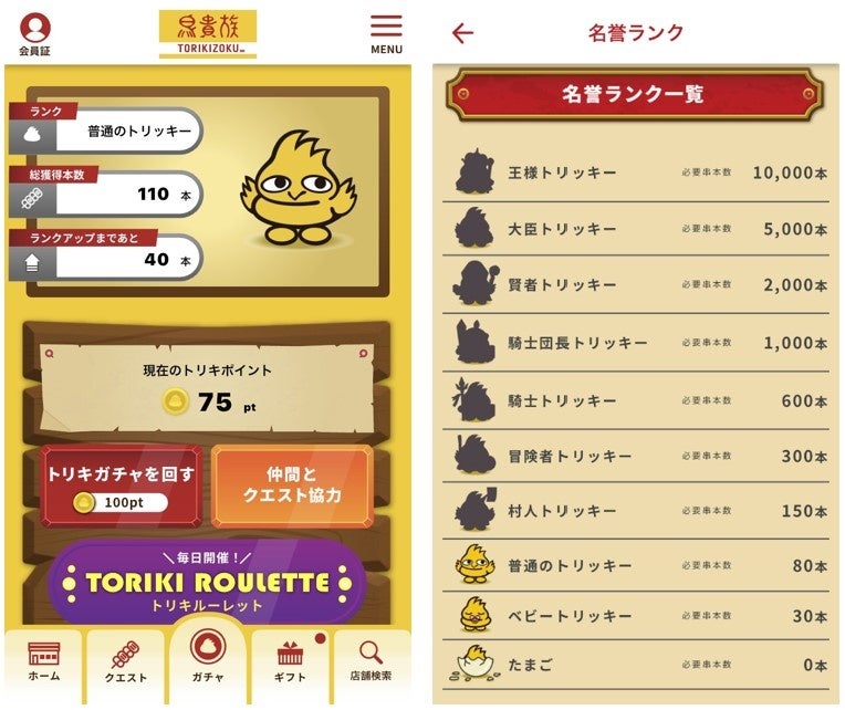 ・アプリ上でアンケート回答や友だち招待、または店舗で指定の商品の注文や、決められた本数の焼鳥をご注文してクエストを達成することでポイントをゲット