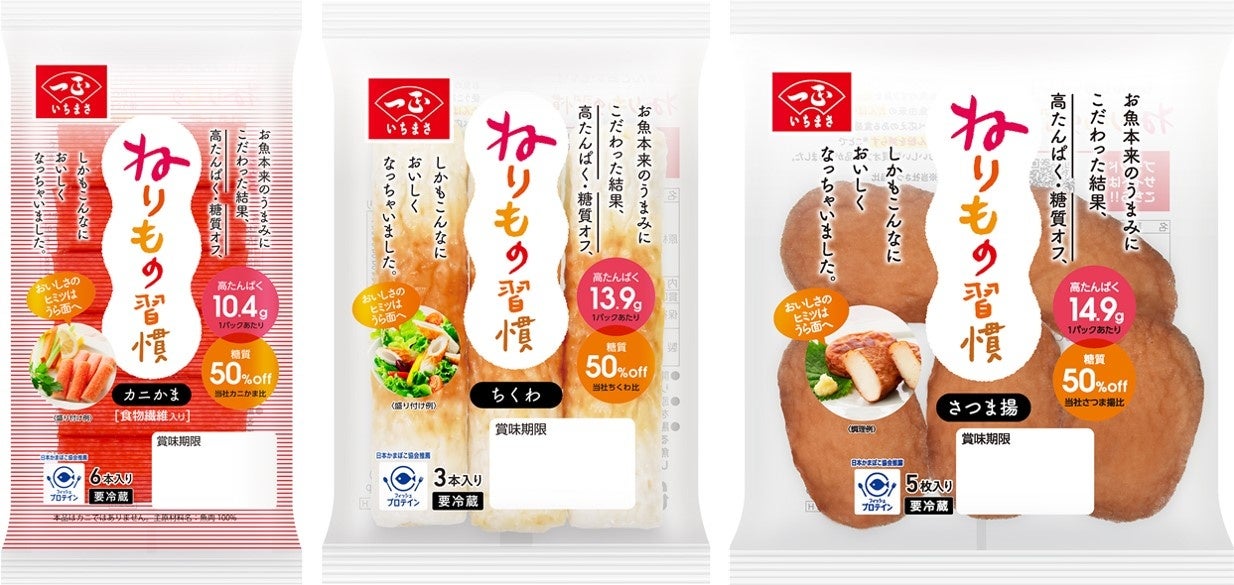 毎日の食生活に習慣的に摂り入れてほしいという想いから、高たんぱく&糖質オフはそのままに、味気なさそう、おいしくなさそうというイメージを払しょくし、魚本来の旨みや食感を生かしてしっかりおいしく仕上げています。ふっくらジューシーな「ねりもの習慣 カニかま」、ぷりっぷりの食感でしっかりと焼き目のついた「ねりもの習慣 ちくわ」、弾力ある食感で食べ応えある「ねりもの習慣 さつま揚」のベーシックな3品をラインナップ。いずれもでん粉や砂糖の使用量を抑えることで従来よりも糖質を50%カット。たんぱく質が1パックあたり10.4g~14.9gと、当社品(※)の1.3~1.8倍多く含まれています。パッケージも素材そのもののシンプルなおいしさを表現したすっきりとしたデザインにリニューアルします。※当社「カニかま」、「ちくわ」、「さつま揚」比