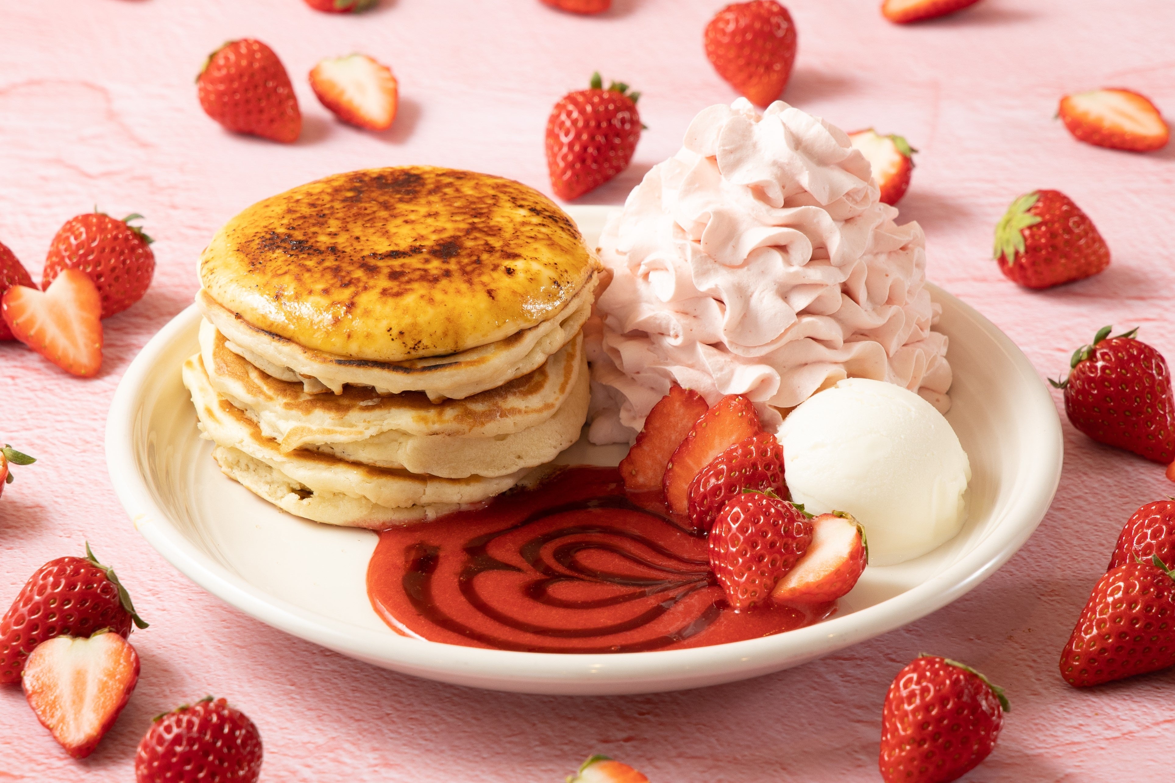 『ストロベリーブリュレパンケーキ』は、春を代表するフルーツ「いちご」をひと皿で3つの楽しみ方ができるのが最大の魅力。それぞれのいちごを、ほろ苦いクレームブリュレパンケーキやいちごの甘味を引き立たせる塩ミルクアイスと一緒にお楽しみください。