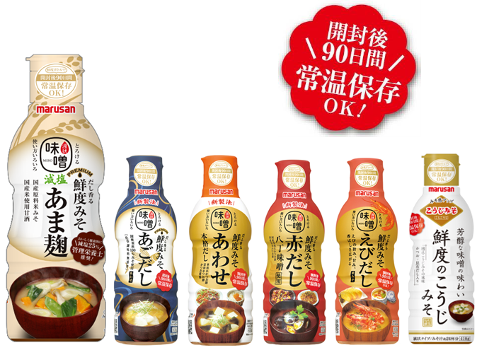 “鮮度みそ”シリーズは“お料理をもっとおいしく!もっと便利に!”、そんな声におこたえするため2017年に誕生した鮮度ボトル採用のだし入りの液状みそです。開封後も90日間常温でおいしさをキープできるので、いつでもどこでも、お湯を注ぐだけでできたてのおみそ汁をお楽しみいただけます。生でも液体でもない“液状みそ”だから、1滴ずつ量を調節できてサッと溶けるので、おみそ汁以外のお料理にも大変便利にお使いいただけます。
