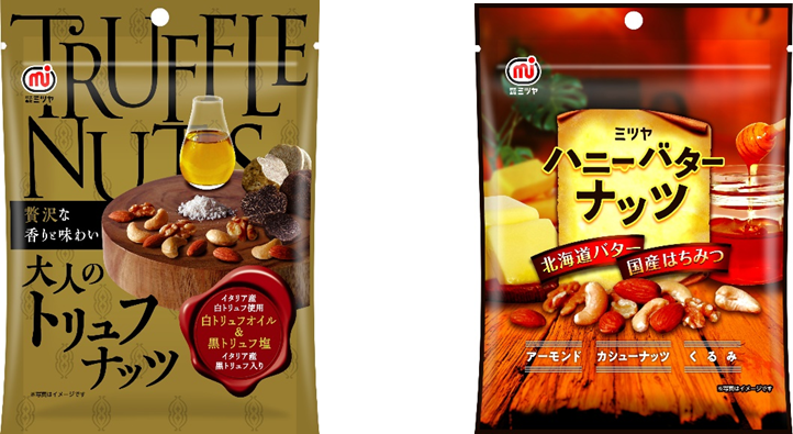 「ひとつぶに、驚きを。」をスローガンに豆・ナッツの製造販売を行う株式会社ミツヤ(本社:福岡県福岡市、代表取締役:原田 耕次、以下ミツヤ)は、黒トリュフ塩と白トリュフオイルの芳醇な香りの『大人のトリュフナッツ』と希少な国産はちみつと北海道バターを使用した『ハニーバターナッツ』の2商品を2023年3月1日(水)よりミツヤ公式オンラインショップおよび全国のスーパーやコンビニで発売開始いたします。