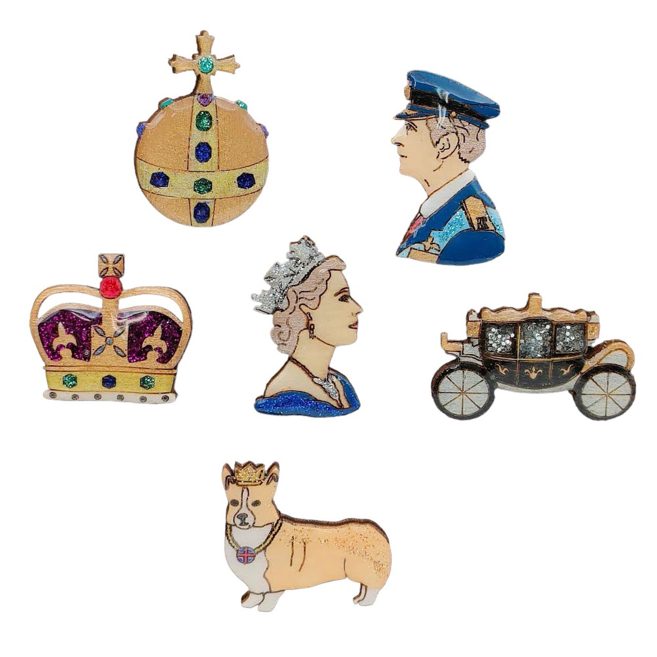 <ベクベクメイクス> ピンバッジ ロイヤル・シリーズ各種 各2,860円 木製、樹脂レジン、英国製