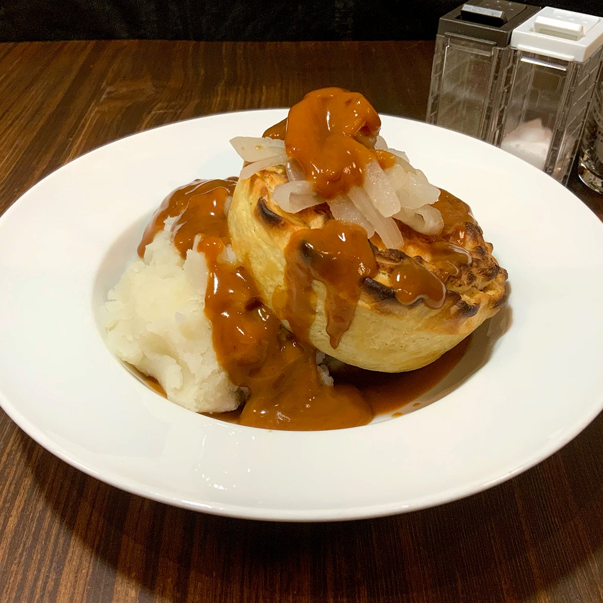 <アッフェンバー>自慢のビーフパイは肉汁たっぷりのビーフと オニオンをパイ生地で包み、オーブンで焼き上げました。クリー ミーマッシュポテトと自家製オニオングレーピーでお召し上がりください。