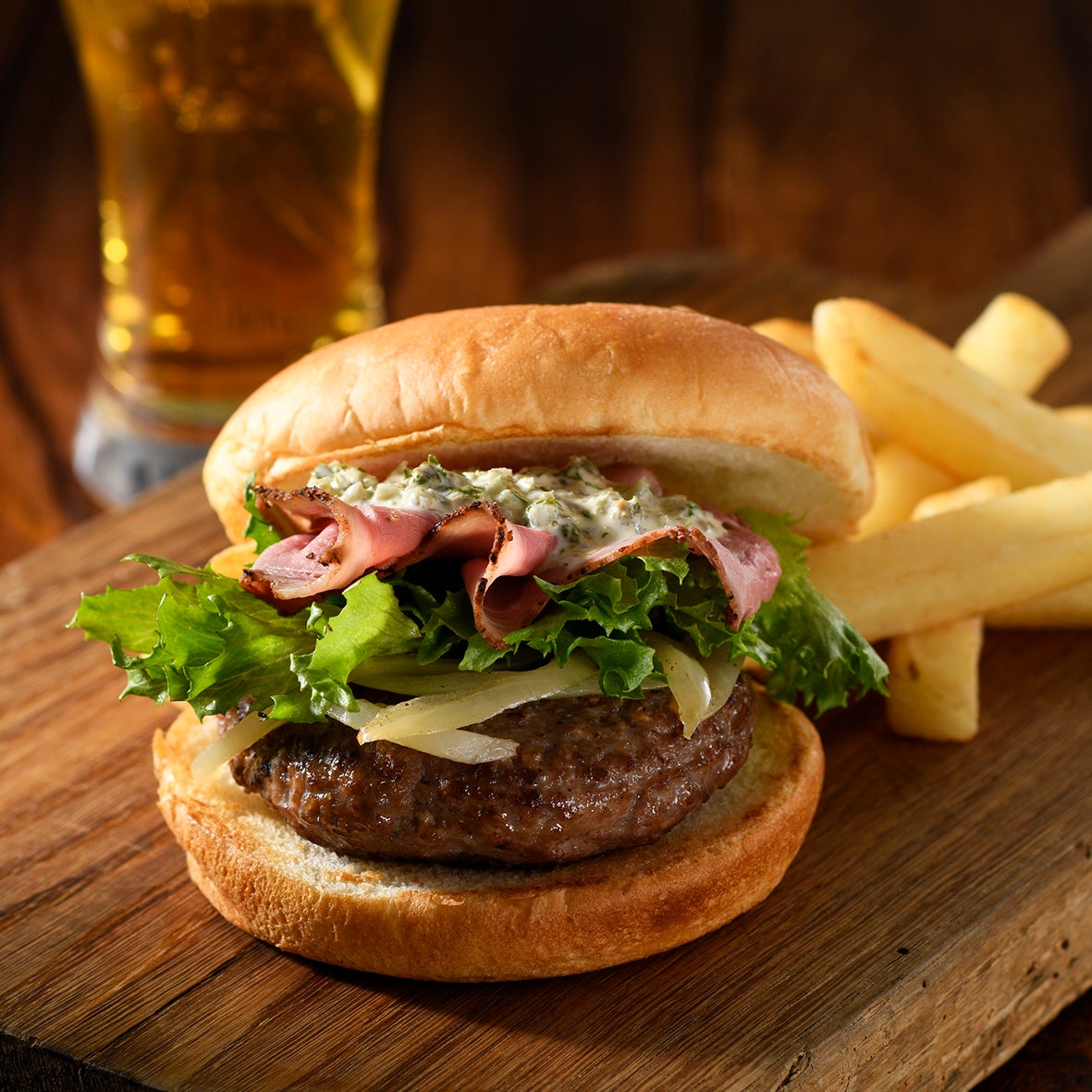 英国産牛肉を使用したローストビーフと、英国産牛肉と豚肉のあいびきのパティ110gを使用したダブルミートバーガー。牛肉の旨みが詰まった食べ応えのあるハンバーガーです。