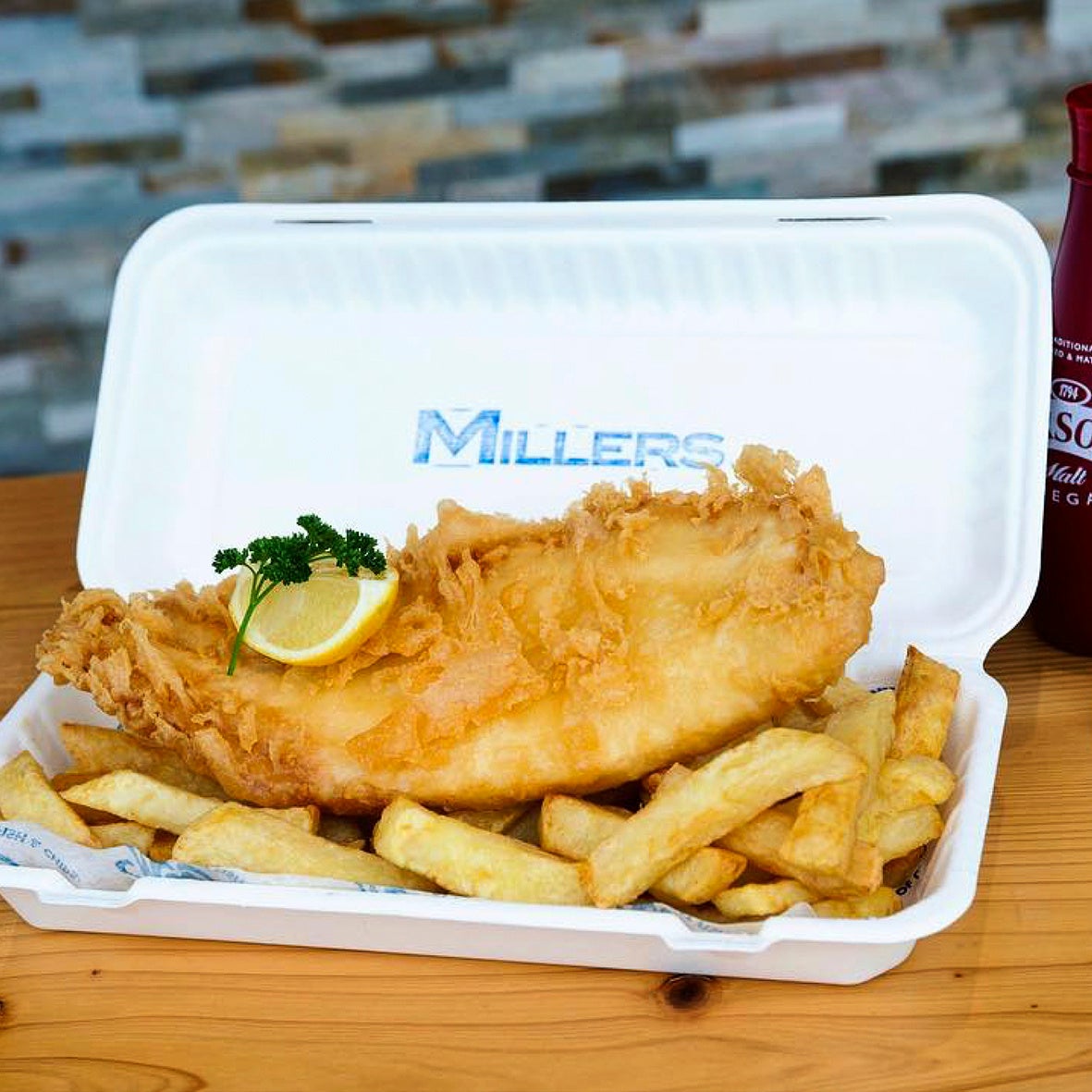 <ミラーズ> フィッシュ&チップス レギュラーサイズ 1,870円 /フィッシュ&チップス ラージサイズ 2,200円 各1人前、日本製 ※写真はラージサイズです。