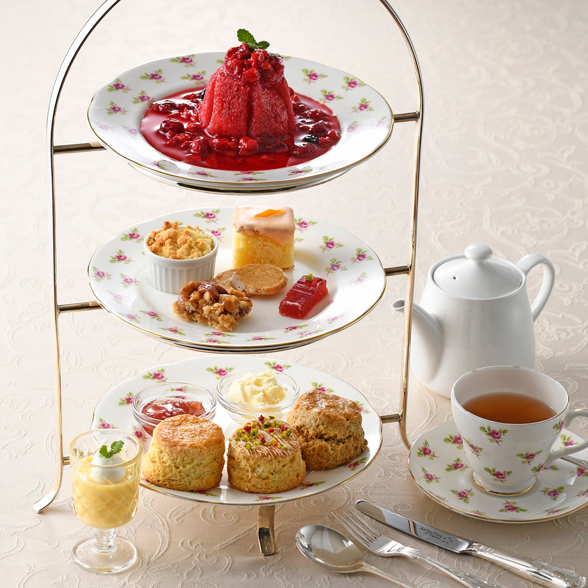 上段:スプリングプディング×1、中段:オレンジドリズルケーキ×1、洋梨とアップルのクランブル×1、アーモンドと クルミのトフィータルト×1、ショートブレッド×2、イチゴのパートドフリュイ×1、下段:ミニスコーン×3(ダブルバ ター、ピスタチオ&クランベリー、ミルクティー)、ショットグラス:レモンポセット、ウェルカムティー(ファーラーズ ジュビリーブレンド)+ポットティー(ファーラーズレイクランドスペシャル)