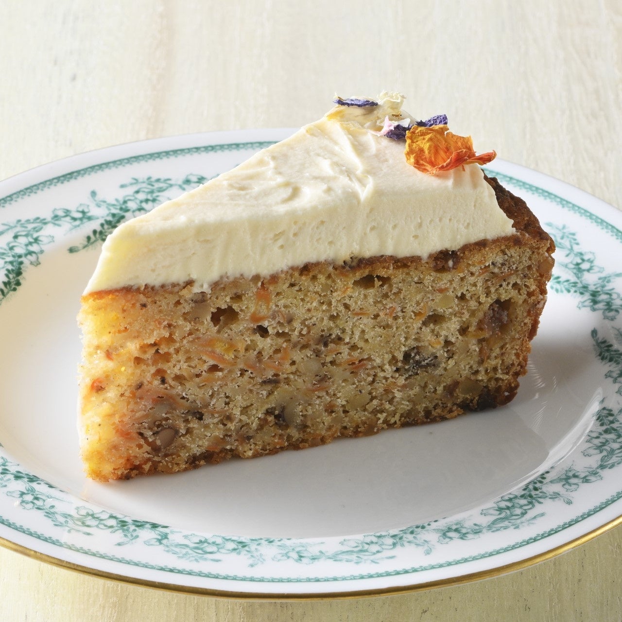 東京湯島の小さな英国菓子店<レイジーデイジーベーカリー>の人気者、キャロットケーキ。粗くすりおろしたニンジンをたっぷり使ったスパイス香る生地は、粗く刻んだサルタナレーズンとクルミがアクセント。今回だけ特別に、トップにクリームチーズアイシングとエディブルフラワーをのせました。