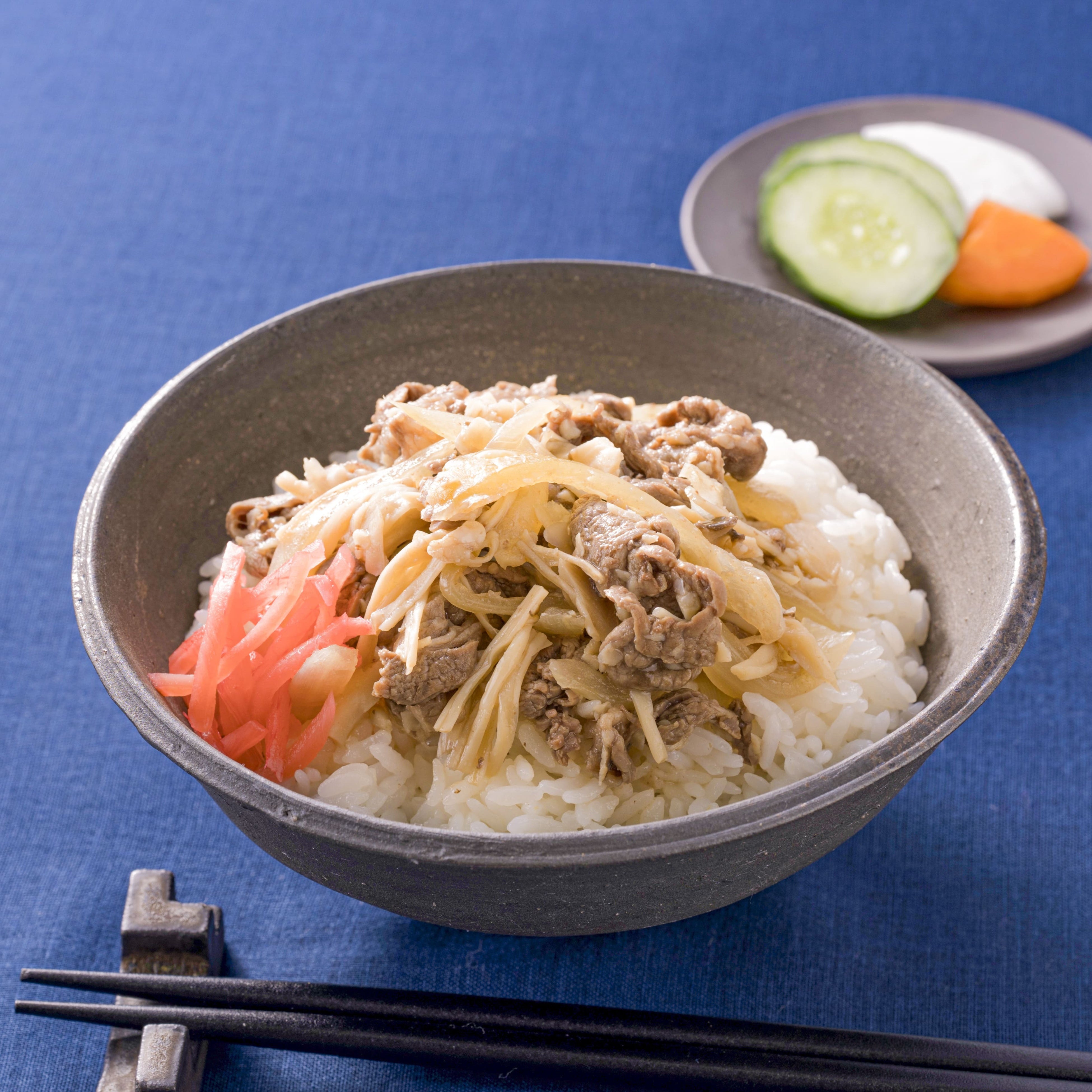 厳選された国産原料で作られた特製の和風タレに牛肉と国産きのこの旨味が加わり、具材だけでなくタレが美味しく、ご飯との相性がバッチリに仕上がっています。牛肉と玉ねぎに加え、国産のエリンギ・エノキをたっぷり使用しており、食感を楽しみながら不足しがちなきのこ類も摂ることができます。
