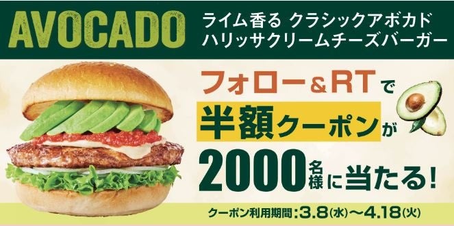 ライム香る クラシックアボカドハリッサクリームチーズバーガーの半額クーポンを2,000名様にプレゼント!はずれても、もれなくクーポンをGETできます!