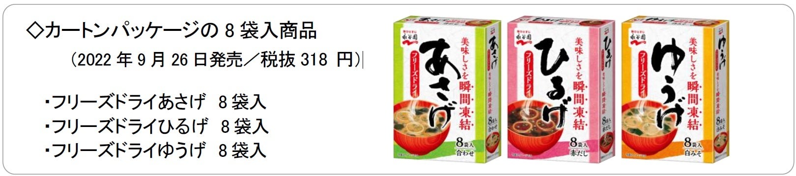 ・カートンパッケージで発売中の「フリーズドライあさげ8 袋入」「同 ひるげ8 袋入」「同 ゆうげ8 袋入」と同じ品質です。
