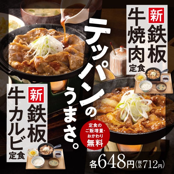また、『鉄板牛カルビ定食』と『鉄板牛焼肉定食』販売開始同日からは、『牛焼肉丼 並盛』568円(税込624円)の販売も開始いたします。『牛焼肉丼』は、「牛丼」同様のサイズ展開となっており、「小盛」から「超特盛」の6種類のサイズがあります。『牛焼肉丼』はテイクアウトでのご利用も可能です。