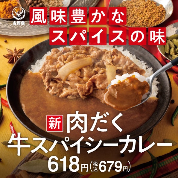 吉野家は3月1日(木)から、『肉だく牛スパイシーカレー』を吉野家全国店舗※で復活販売します。『肉だく牛スパイシーカレー』は、27種類のスパイスを使用したルーの隠し味にりんごの甘みと唐辛子の辛さを加え、深いうまみとすっきりとした後味が感じられるカレーです。今回の復活販売にあたり、従来から使用している「カルダモン」の量を増量し、より清涼なスパイス感を感じられるようにしました。 ※ 一部店舗では販売していません。また、価格が異なる店舗があります。