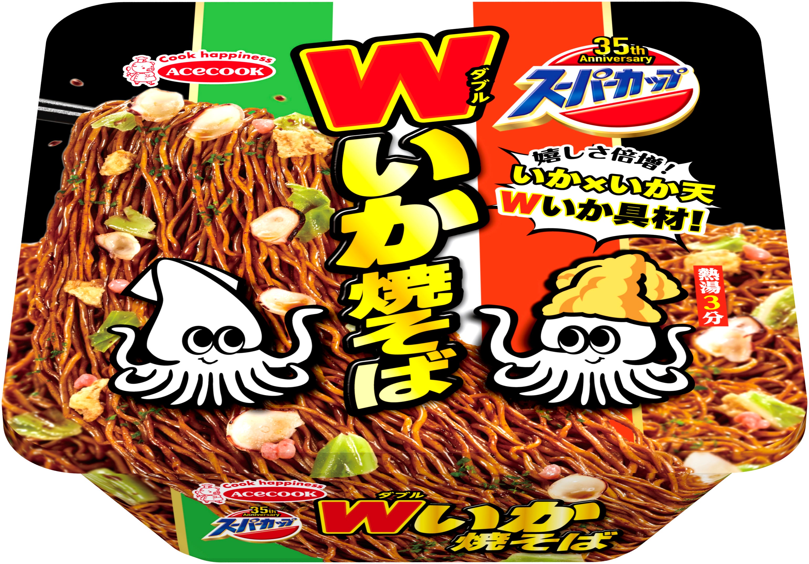 ① スーパーカップ35周年を記念し、シリーズの中でも特に人気の高い「いか焼そば」から、”いか×いか天”のWいか具材で嬉しいスペシャル仕様の新商品を開発!