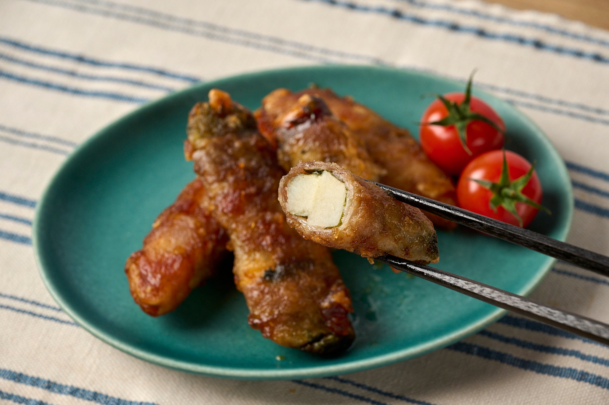 多古町のやまと芋を元気豚で巻いて醤油ダレで仕上げました。