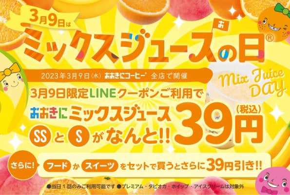 「おおきにミックスジュース」を当日限定で39円(税込み)の特別価格にてお買い求めいただけるLINEクーポンを明日3月2日より配信いたします。