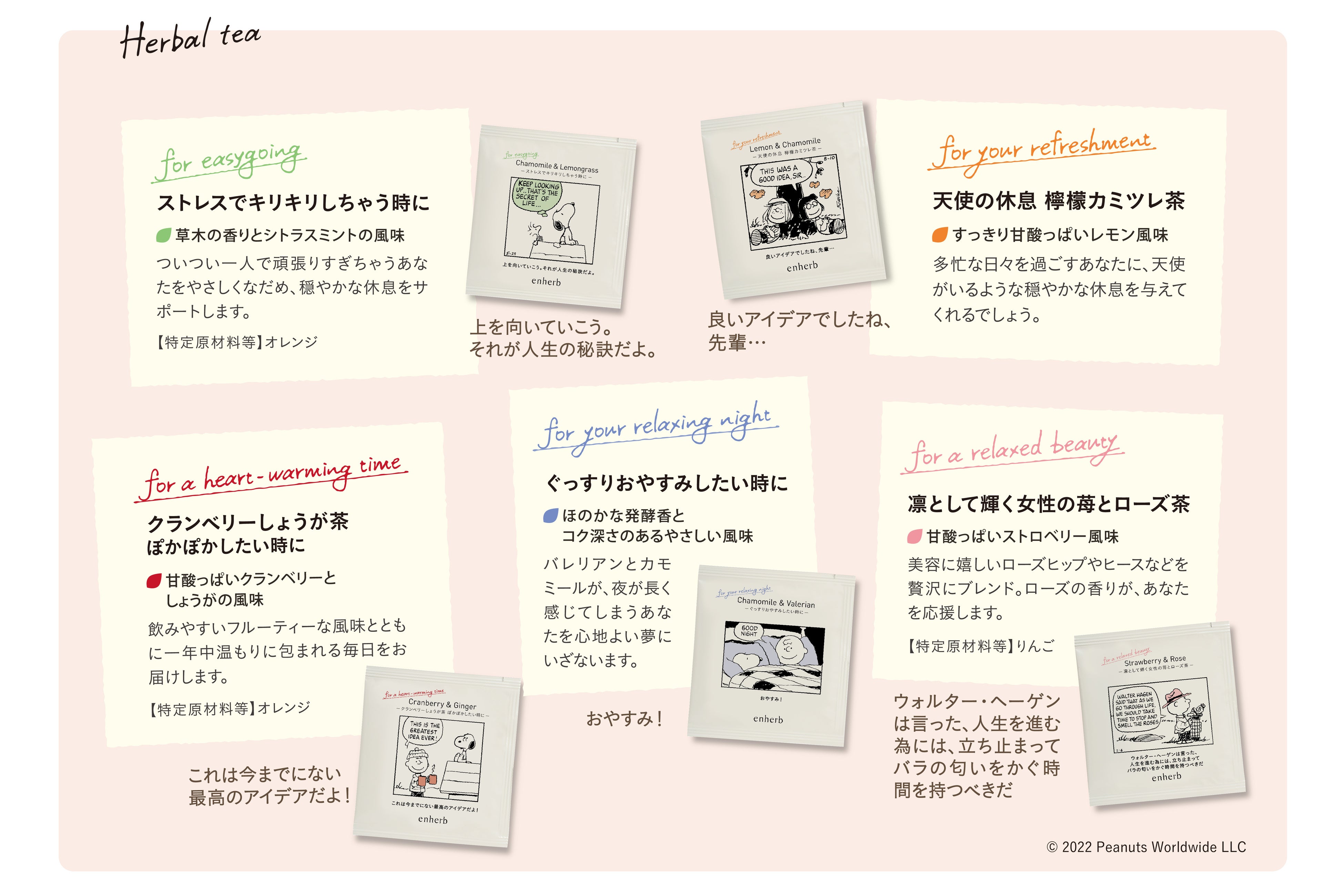 気持ちをほんのり楽にしてくれるスヌーピーたちからのメッセージとともに、香り豊かで華やかな色合いのハーブティーがリラックスシーンに寄り添います。