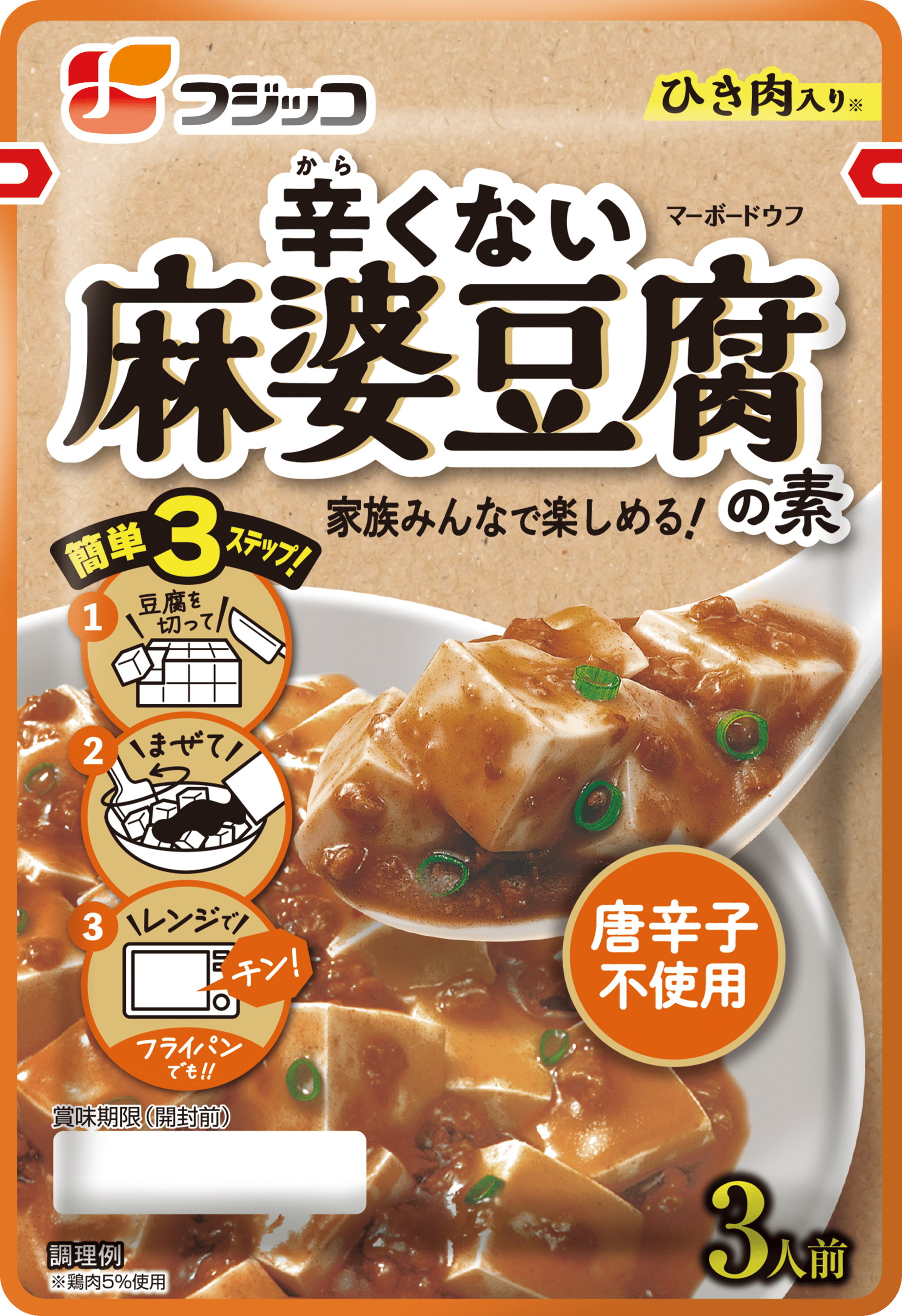 フジッコ株式会社(本社:神戸市中央区/代表取締役社長執行役員:福井正一)は、レンジで手軽に調理ができる「麻婆豆腐の素」の新商品として「辛くない 麻婆豆腐の素」を、2023年3月1日(水)より新発売いたします。併せて、同シリーズである「麻婆豆腐の素 中辛」をリニューアルして発売いたします。