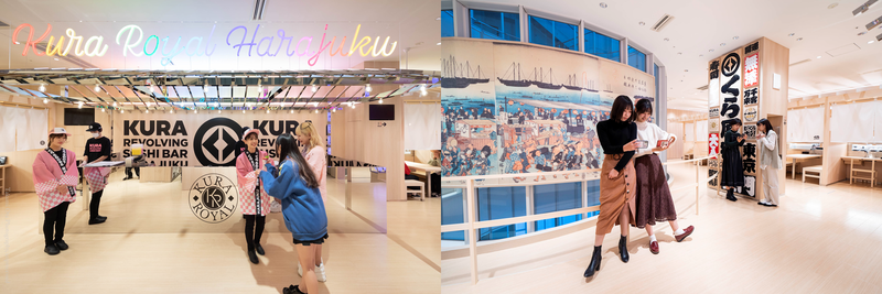 インテリアデザインのコンセプトは、「日本の伝統文化×トウキョウ・ポップカルチャー」。Z世代のお客様をターゲットにSNS映えを意識した、様々な色に光る「カラフル提灯ウォール」や近未来的な「スイーツ屋台」、「巨大浮世絵」からロゴウォールまで設置しています。また、障子を閉めることで個室になるボックスシートのほか、スカイツリーなどの眺望が楽しめるテラス席「バルコニー飲食スペース」、さらに原宿の街並みを見ながらお食事できるスタンド席も、くら寿司で初めて導入しています。