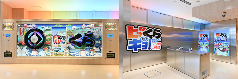 大手外食チェーン最高峰“店内エンターテイメントアトラクション”として、「浅草」でご好評いただいている「射的」をデジタル化した『デジタル射的「ビッくらギョ!」』に加え、1階はリアルとデジタルが融合、2階はフルデジタルを採用した巨大な『ビッくらポン!DX』を初導入。「ビッくらポン!」と「射的」がデジタル化し、フロアに設置された専用機器でお楽しみいただけます。また、様々な色に光る「カラフル提灯ウォール」や、「巨大浮世絵」から「ロゴウォール」まで、フォトスポットが満載のデザインです。