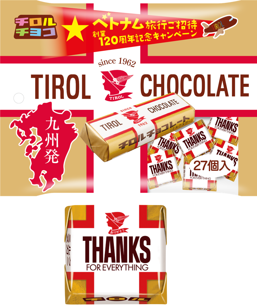 120周年、そしてチロルチョコベトナム工場の竣工を記念し、60組120名様にベトナム旅行が当たるキャンペンーンも発表されました。キャンペーンには、チロルチョコ120周年の特設サイトから誰でも応募が可能です。