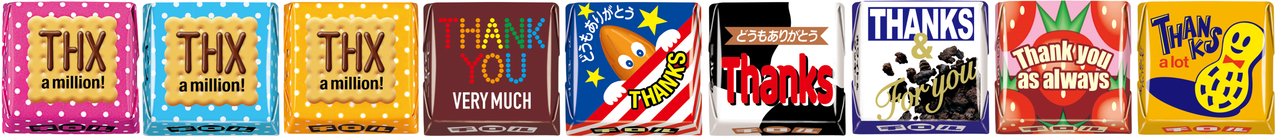 1962年に誕生した元祖チロルチョコ。ピーナッツ入りのミルクヌガーをミルクチョコで包んだ食べやすい一口サイズの袋商品です。120周年を記念し、中の個包装はすべて「THANKS」と書かれた期間限定デザインになっています。個包装の裏のワンポイントには100個に1個レアデザインが入っています。