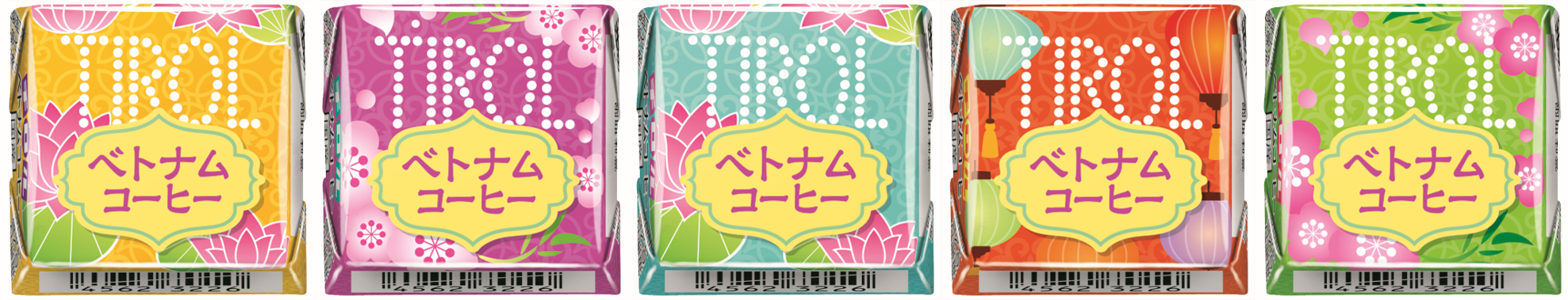 チロルチョコのベトナム工場竣工を受け、伝統的な淹れ方で飲むベトナムコーヒーを再現しました。ベトナム産コーヒーを3.8%使用した苦味の効いたベトナムコーヒーチョコに、濃厚な練乳風味ソース、ミルククリームを合わせました。個包装は、ベトナム雑貨やアオザイを彷彿とさせる花柄やランタン柄をあしらった5色展開のカラフルなデザイン。