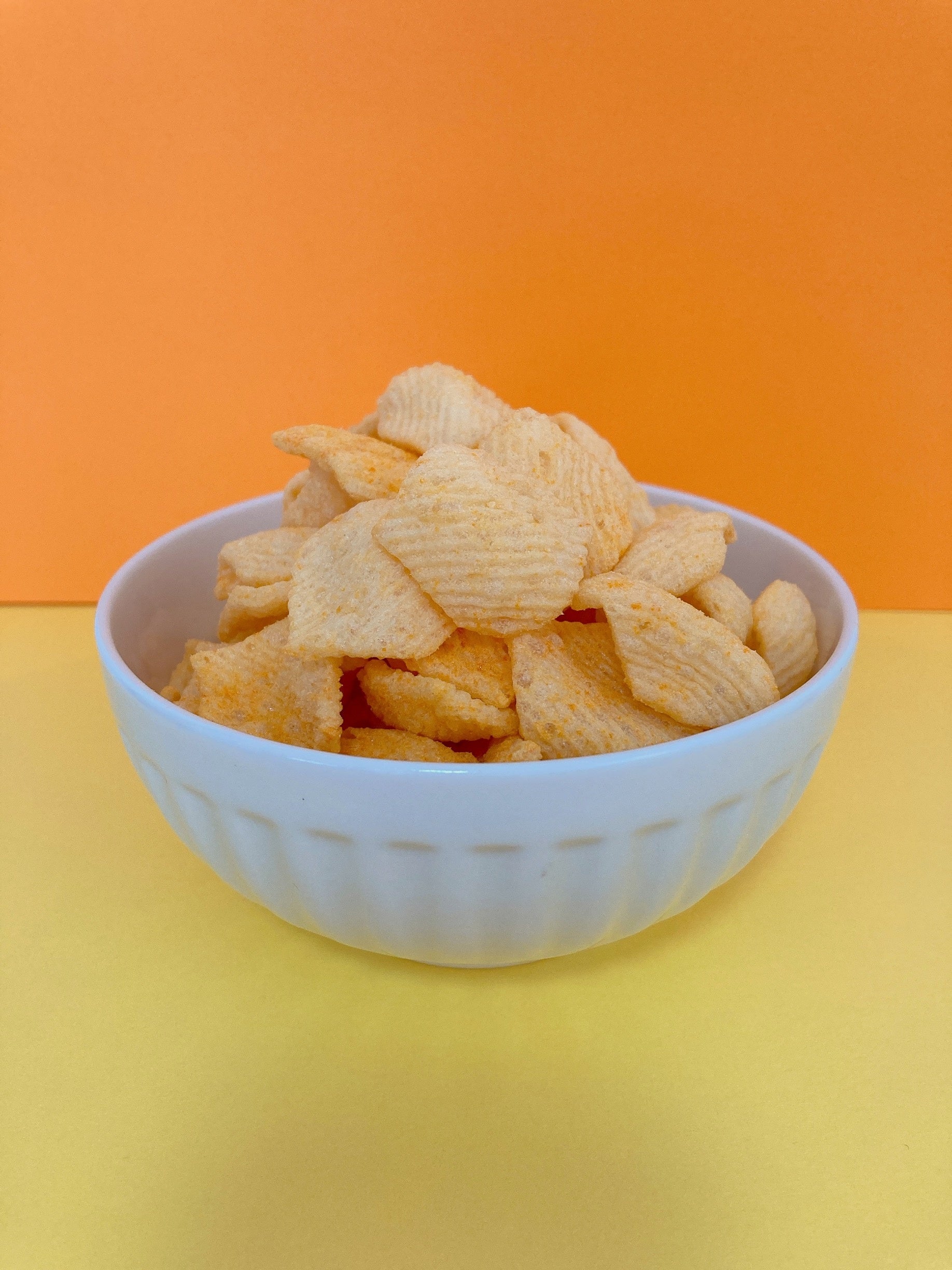 1978年に発売した「チーズビット」は、小さくて可愛らしいアーモンド型で、コーンとチーズの旨味の絶妙なバランスが幅広い層のお客様に親しまれており、2016年からは味名を「濃厚チェダーチーズ味」として販売しています。チェダーチーズの濃厚な味わいに加え、スイートコーンを生地に練り込むことでまろやかな後味も楽しめるふわっと軽い食感の春夏限定商品です。お客様からは「サクサク軽い食感がクセになる」「チーズが濃厚」とご好評いただいています。