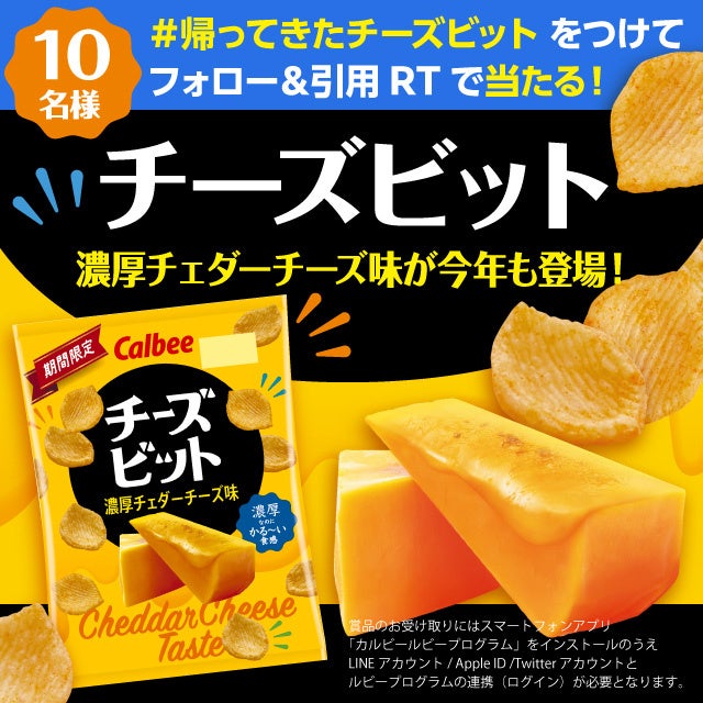 カルビー「サッポロポテト」公式Twitterアカウント(@CalbeeSapporoCP)をフォローの上、#帰ってきたチーズビットをつけて、当該投稿を引用リツイートした方の中から抽選で10名様に『チーズビット 濃厚チェダーチーズ味』(52g)12袋をプレゼントします。