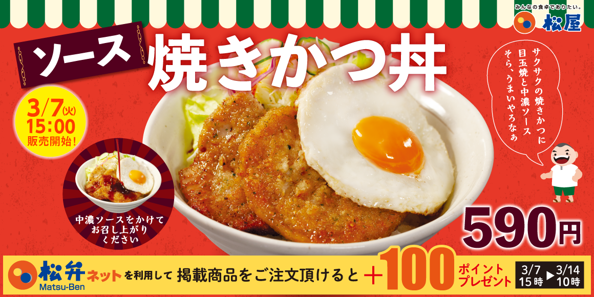 3月7日15時~3月14日10時まで、松弁ネットを利用して「ソース焼きかつ丼」関連商品をご注文頂けると、100ポイントプレゼントいたします。