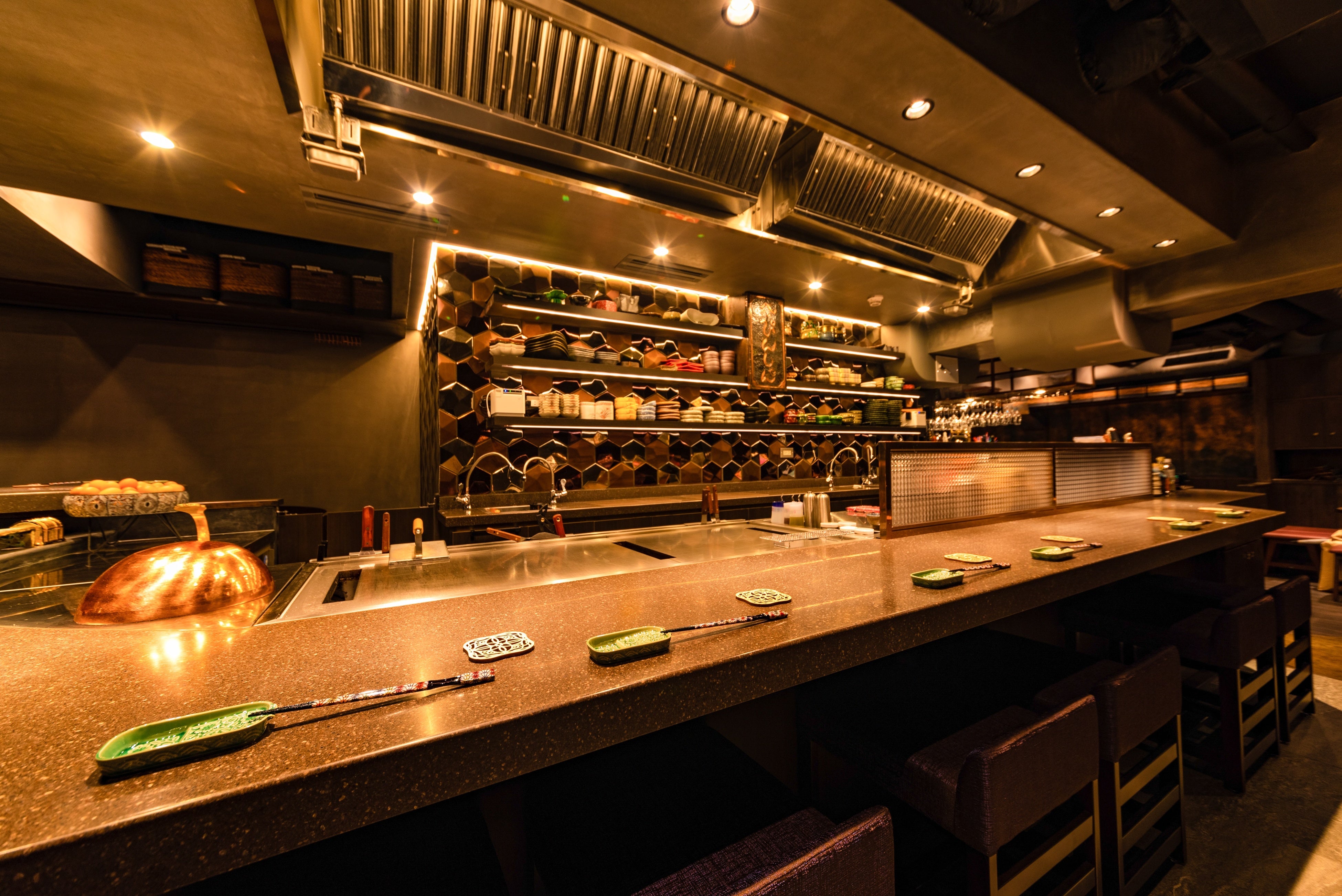 鉄板を囲むように作られたカウンター席は全21席ご用意しております。目の前で作られる臨場感、お店ならでは の楽しい雰囲気を存分に味わうことができます。また、テーブル席は22席あり、デートから、職場の宴会など、 2名様〜団体様まで幅広く対応可能です。