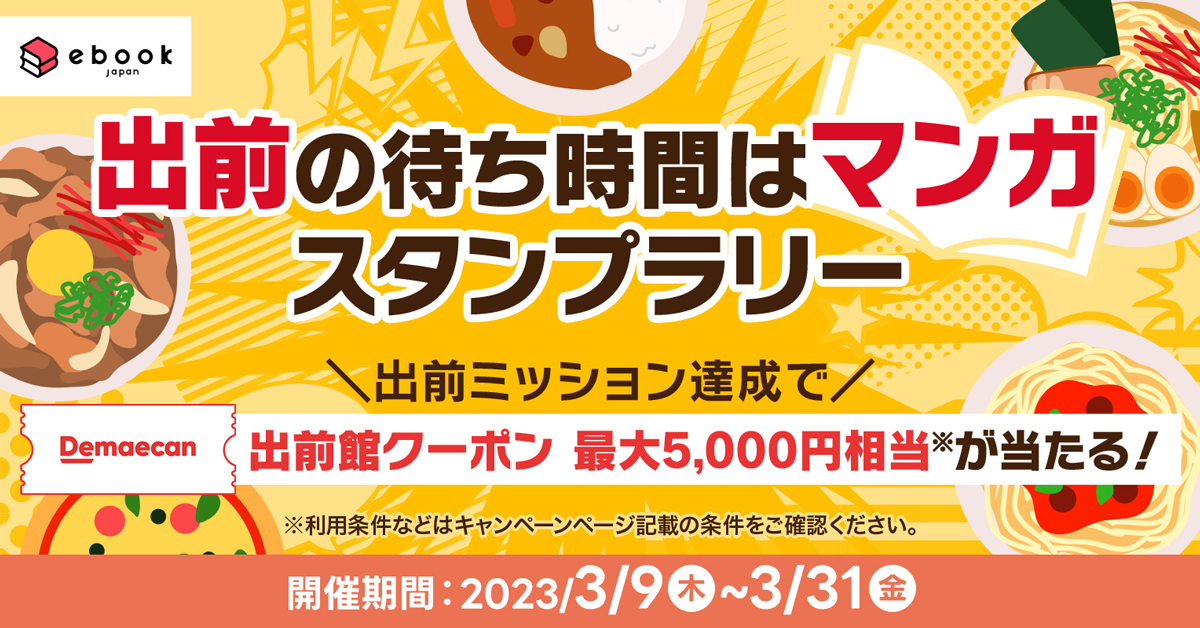 株式会社出前館(本社:東京都渋谷区、代表取締役社長:藤井英雄)が運営する日本最大級のデリバリーサービス「出前館」は、電子書籍販売サイト「ebookjapan」をヤフー株式会社と協力して運営する株式会社イーブックイニシアティブジャパン(本社:東京都千代田区、代表取締役社長:高橋将峰)とのコラボキャンペーンを2023年3月9日(木)から開催します。