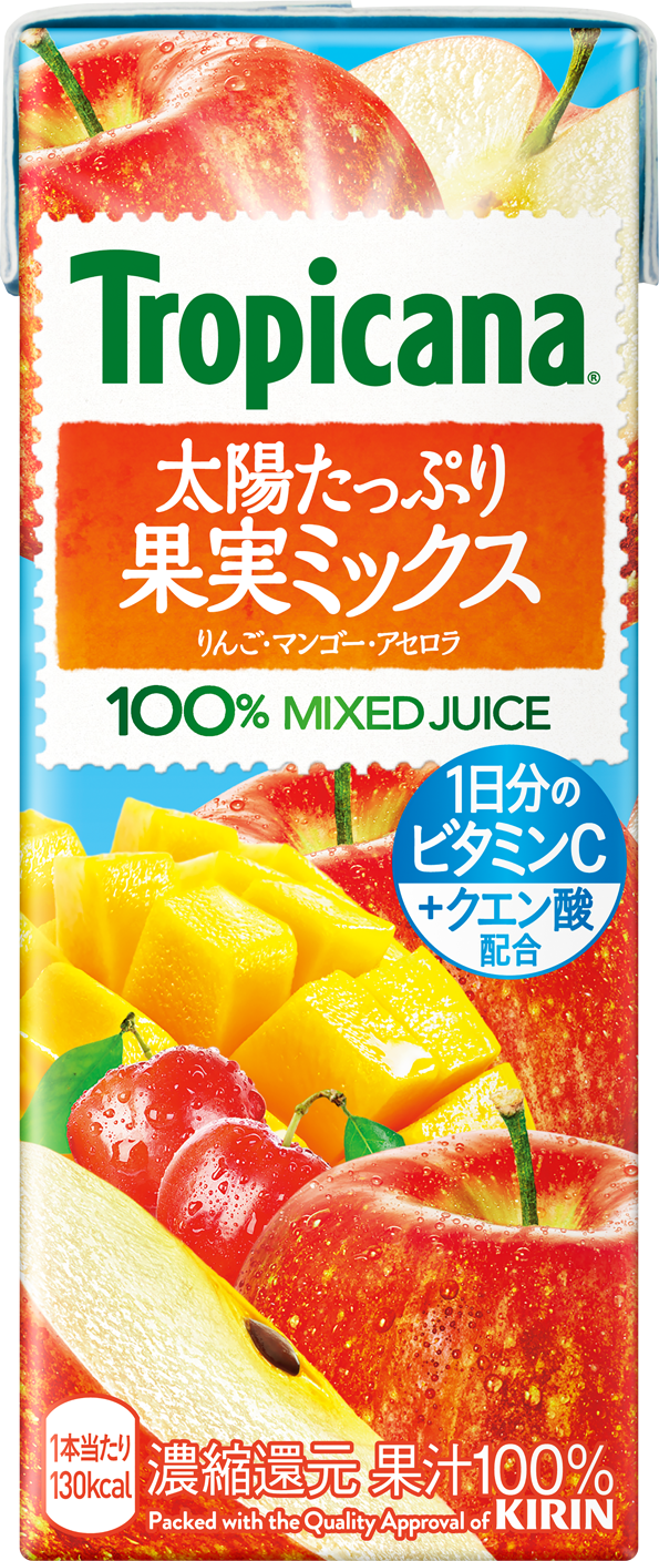 今回発売する「トロピカーナ 太陽たっぷり果実ミックス」は、りんごに、マンゴー、アセロラをミックスした春夏にぴったりの爽やかな味わいが楽しめる100%果汁飲料で、「1日分※2のビタミンC」に加え「クエン酸」もおいしく手軽に摂取できます。本商品の発売を通じて、お客様の毎日に、おいしい健康をお届けします。