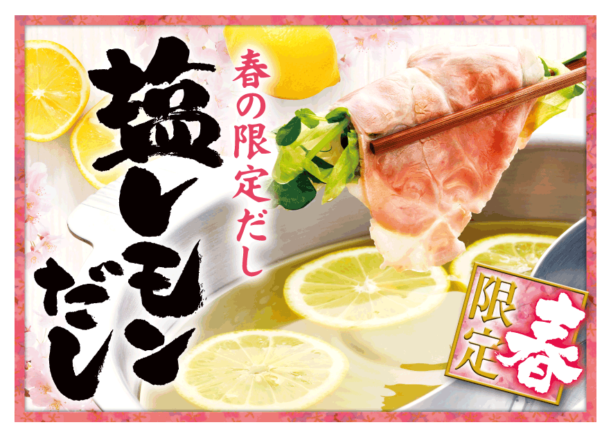 季節限定の「塩レモンだし」は、素材の美味しさを一層引き立てる「赤穂の塩」を使用し、レモンの程よい酸味が食欲をそそる”塩レモン仕立て”。また春限定の具材として「生あおさ海苔つみれ」のほか、お好みのお肉と一緒に食べたい「春の巻きしゃぶ野菜〜水菜、刻み揚げ、紅芯大根〜」や、春食材の「筍と豆苗の盛合せ」も登場。〆に「刻みねぎ」と「海老ワンタン」、「中華めん」を加えて、海老ワンタン麺としてお召し上がりいただくのもオススメです。