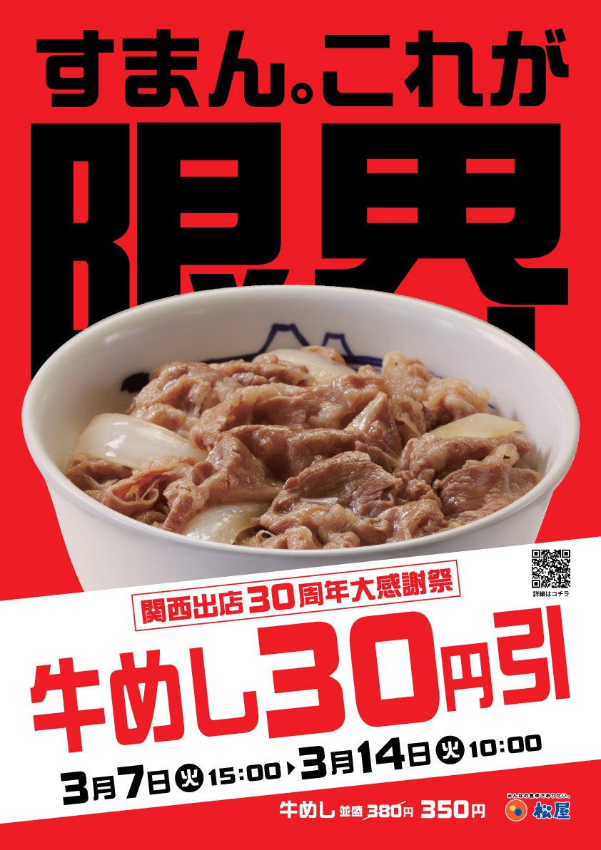 ■1週間限定!関西出店30周年を記念し、380円の牛めしを30円引きの350円でご提供