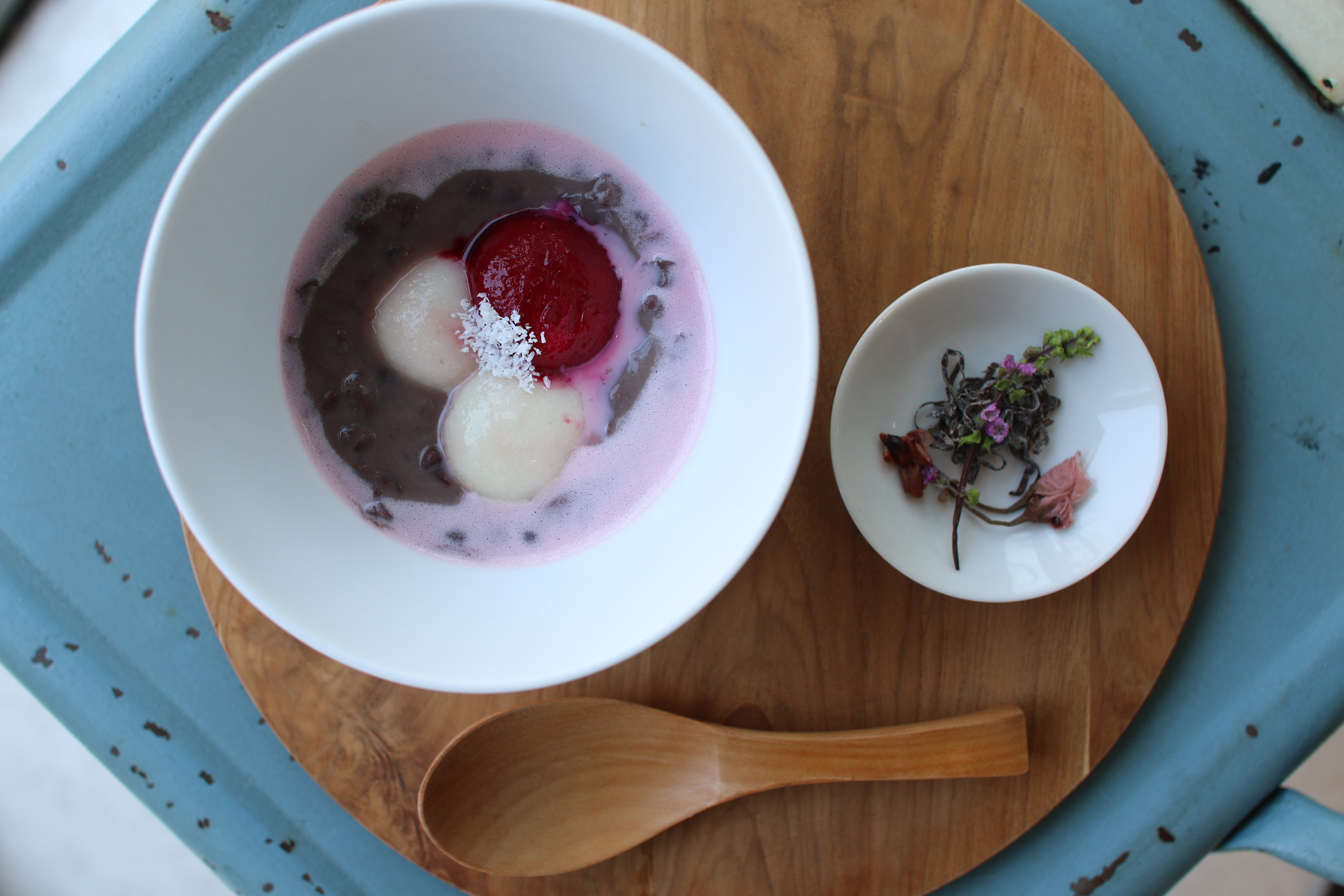 「THE OMOCHI」を使用した、ふんわり桜色がかわいい、ココナッツミルクでアジアのチェー(ぜんざい)風。赤いお餅はビーツで色付けされており、体に優しい味わい。桜の塩漬け昆布と一緒に。