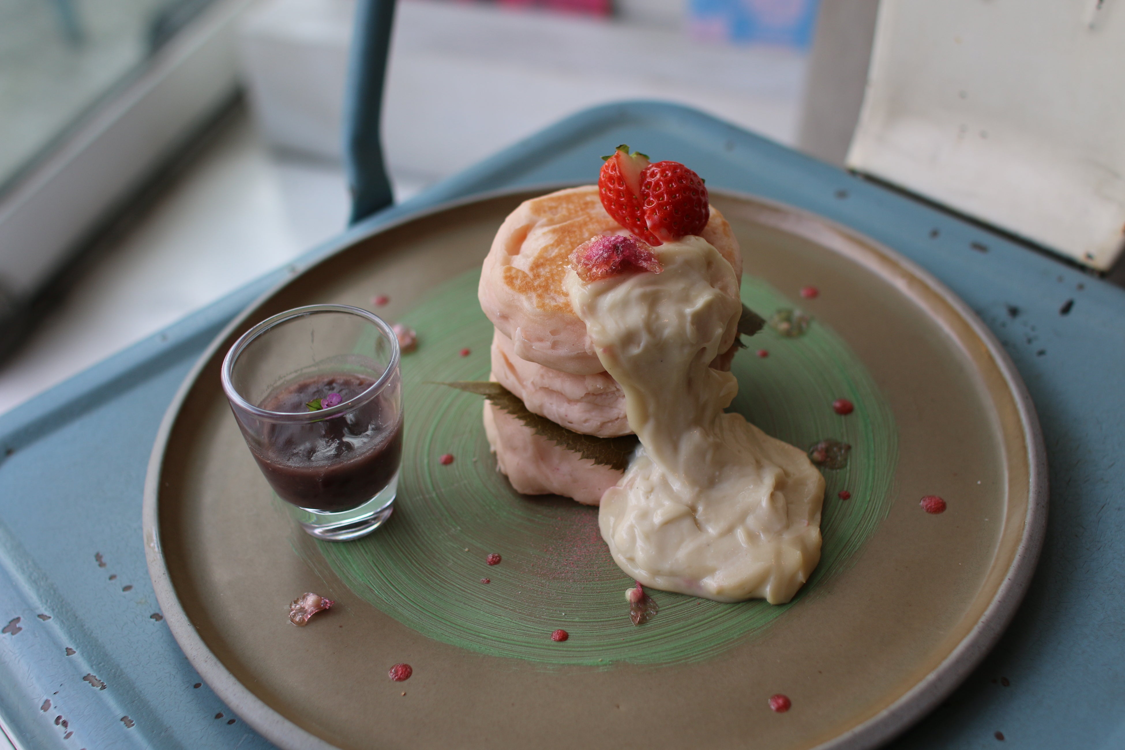 TREEの新名物スイーツとなったヴィーガンパンケーキ。グルテンフリーとは思えないパンケーキ生地は桜味でほんのりピンク色に。豆乳クリームとあんこで甘さ控えめながら、しっかり甘いものを食べた満足感。