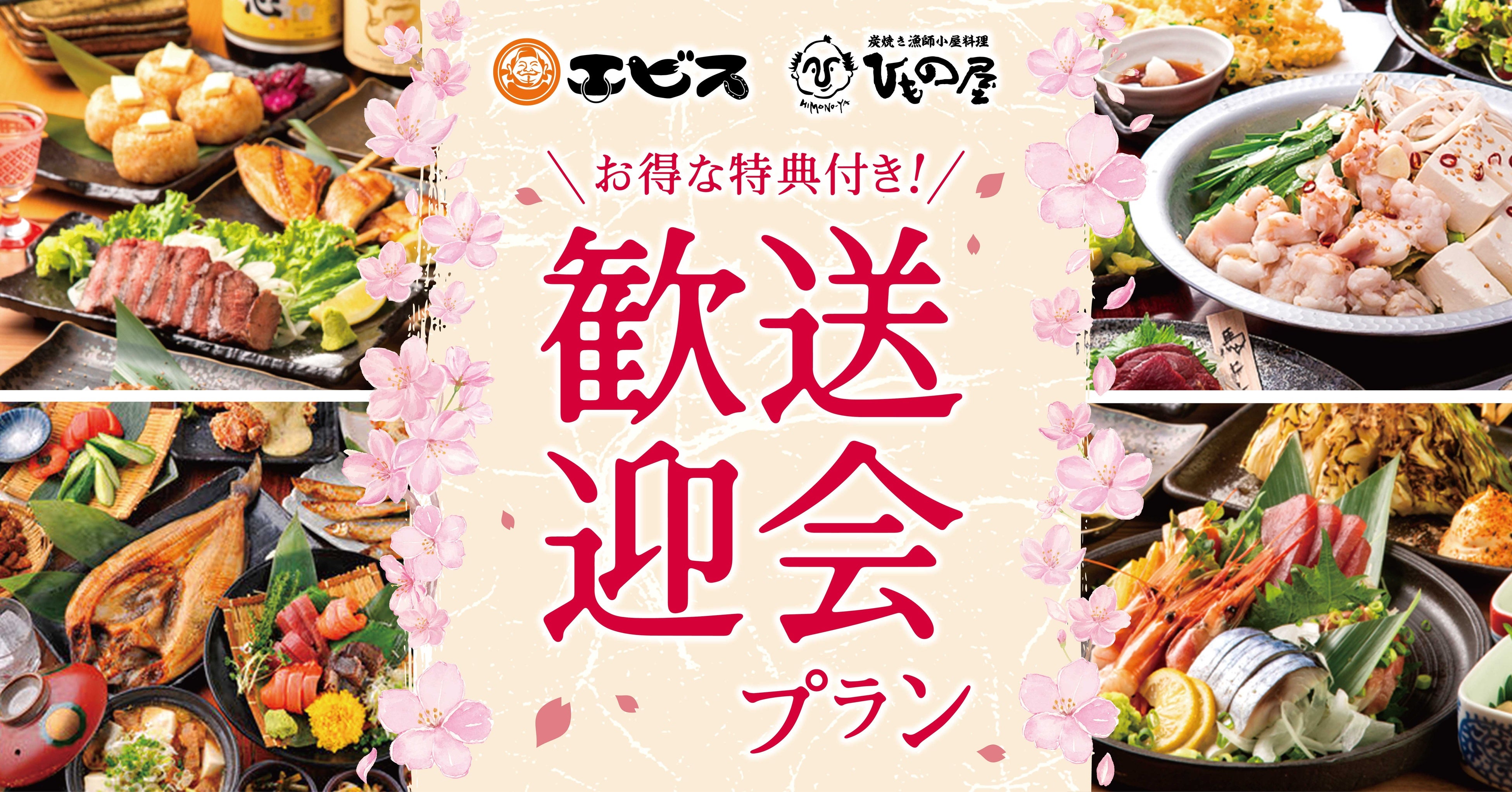 3月4月は歓送迎会シーズン。炭焼漁師小屋料理「ひもの屋」と九州料理酒場「エビス」では、4つのお得な特典が付いてくる「歓送迎会プラン」をご用意いたしました!4,000円以上の飲み放題付きコース全てに特典を付けることができ、2名様からご予約可能となっておりますので少人数制の飲み会にもピッタリ!お世話になった方への大事な送別会や、新入社員や新人の歓迎会にぜひご利用ください。