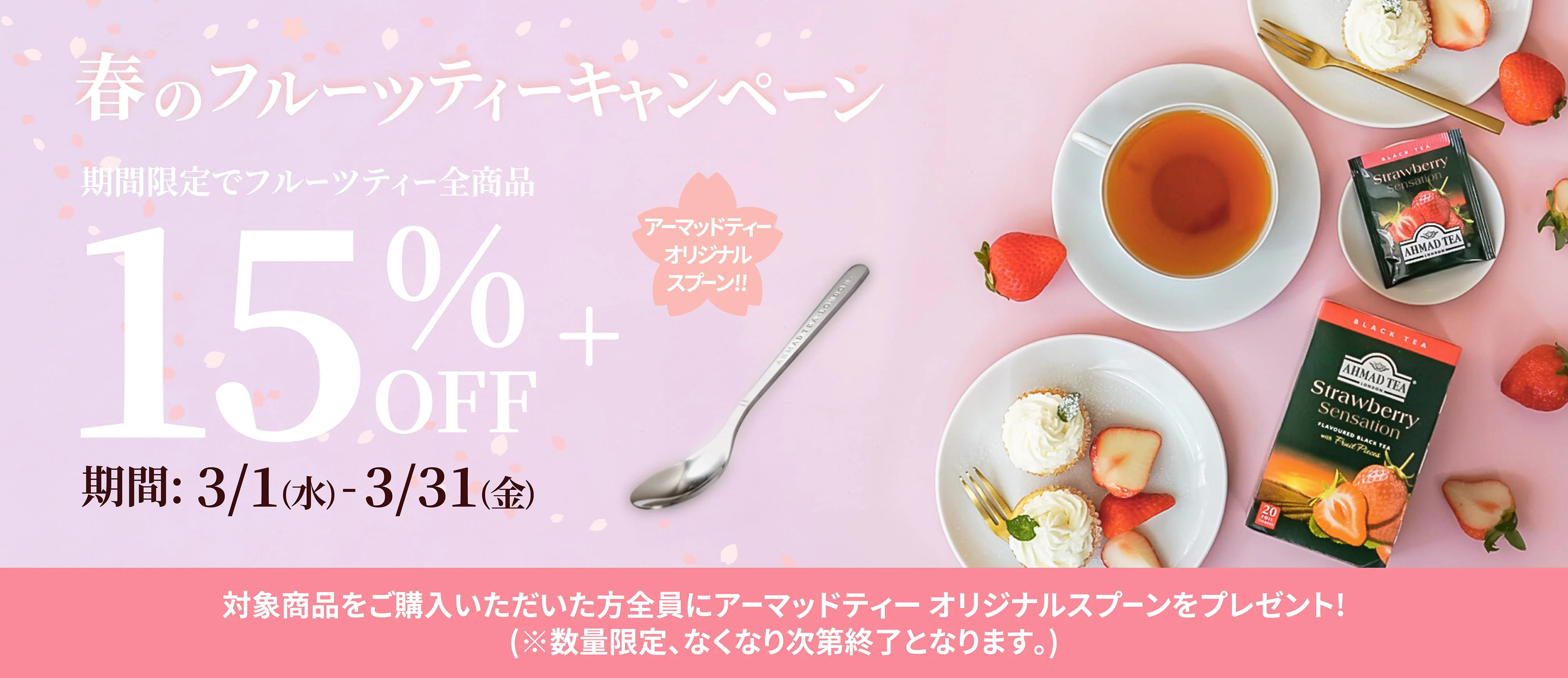 春の陽気が待ち遠しいこの季節、アーマッドティー公式オンラインショップでは、フルーツフレーバー紅茶をお得にお楽しみいただける「春のフルーツティーフェア」を実施いたします。実施期間中は対象のフルーツフレーバー紅茶を定価の15%OFFにてお買い求めいただけます。また、期間中に対象商品をお買い上げの方にはアーマッドティー オリジナルティースプーン(数量限定)をプレゼントいたします。