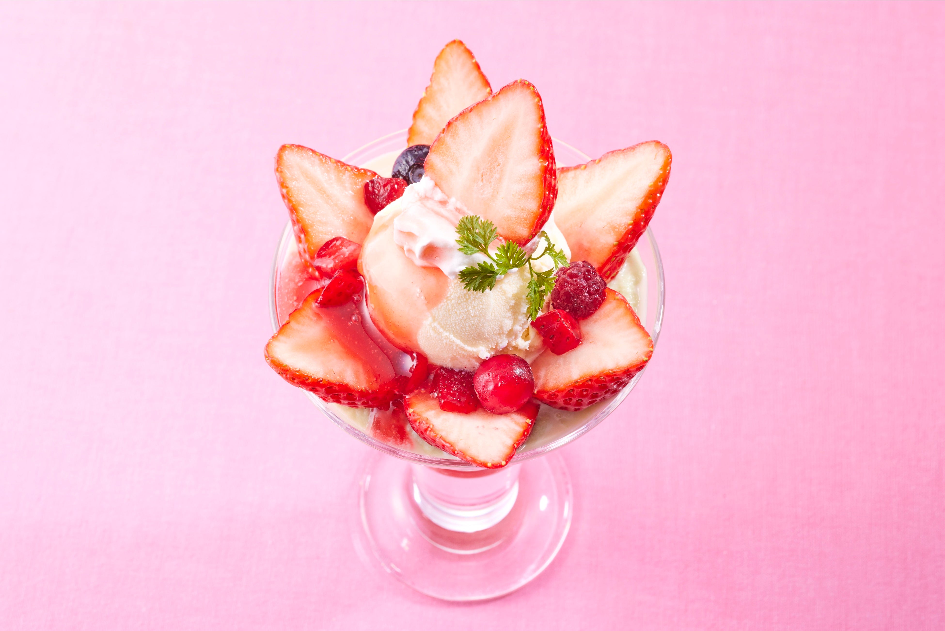 今回の目玉は、苺をメインにした2種類のパフェで、フレッシュ苺とベリーをたっぷり使った「苺たっぷり贅沢パフェ(税込878円)」と、もう1つは苺と雪見だいふく、そしてハート型のパイを添えた「苺とピスタチオのもちもちパフェ(税込768円)」を販売します♪