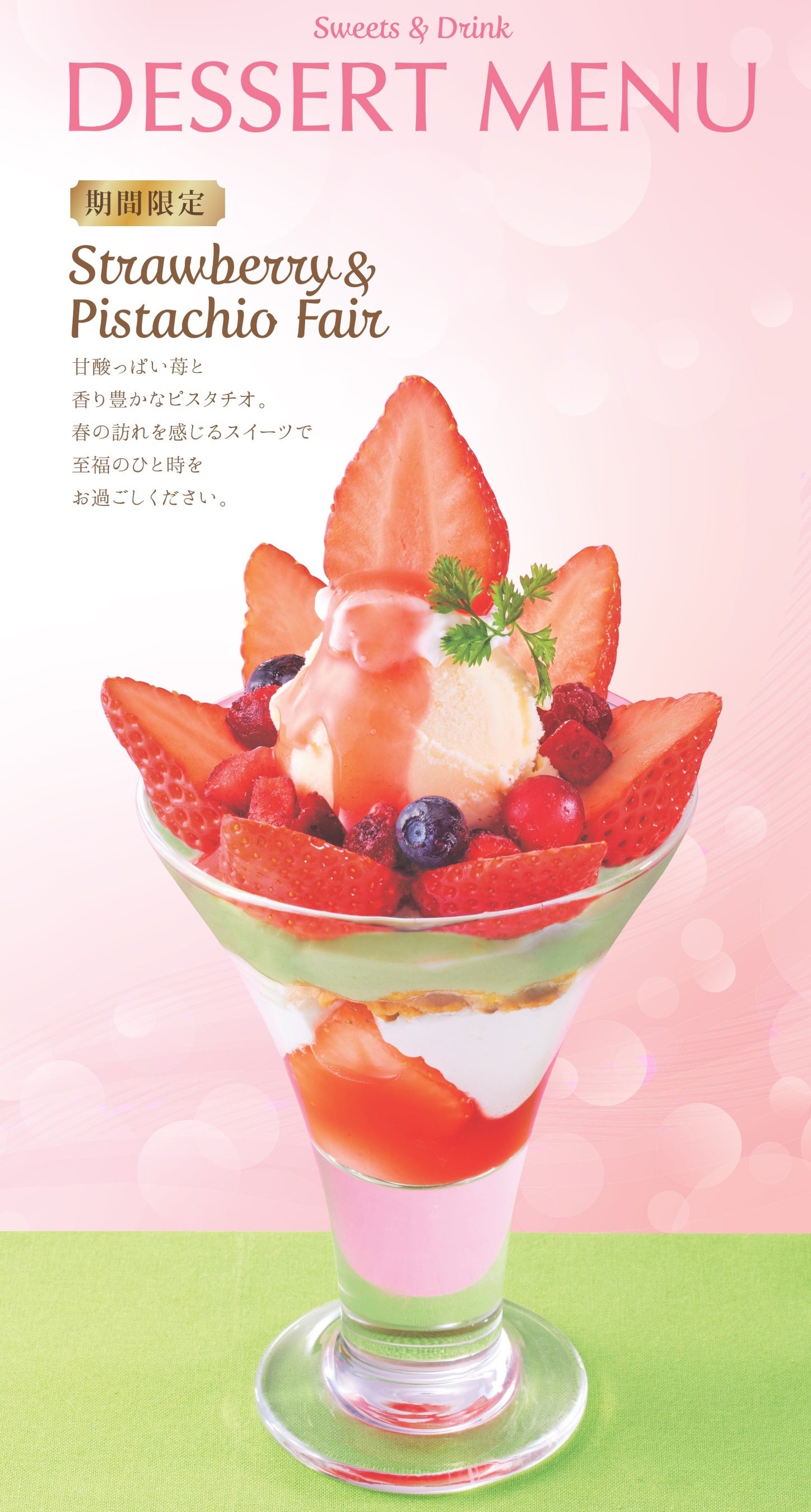 どちらのパフェも香り豊かなピスタチオクリームをアクセントとして使い、甘酸っぱい苺と味も見た目も相性が良く、まさに春色のパフェをお楽しみいただけます。