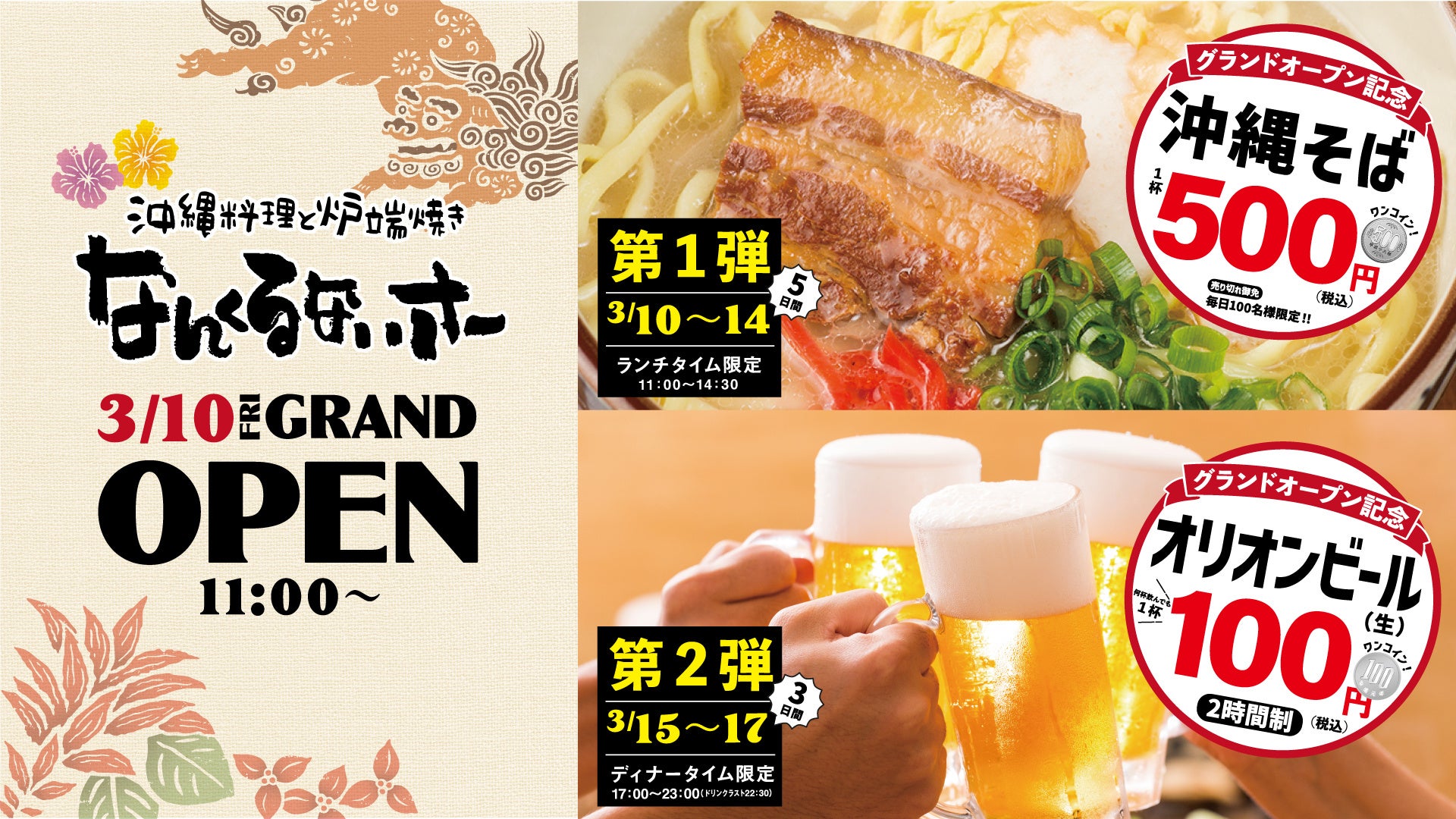 この度、約7年ぶりの新店9店舗目となる「沖縄料理と炉端焼き なんくるないさー」を秋葉原UDXに3月10日(金)にオープンいたします。オープンを記念してランチで人気の「沖縄そば」と、沖縄の県民ビールである「オリオンビール」を特別記念価格でご用意いたしました。この機会にぜひ、「沖縄料理と炉端焼き なんくるないさー」へお越しください!