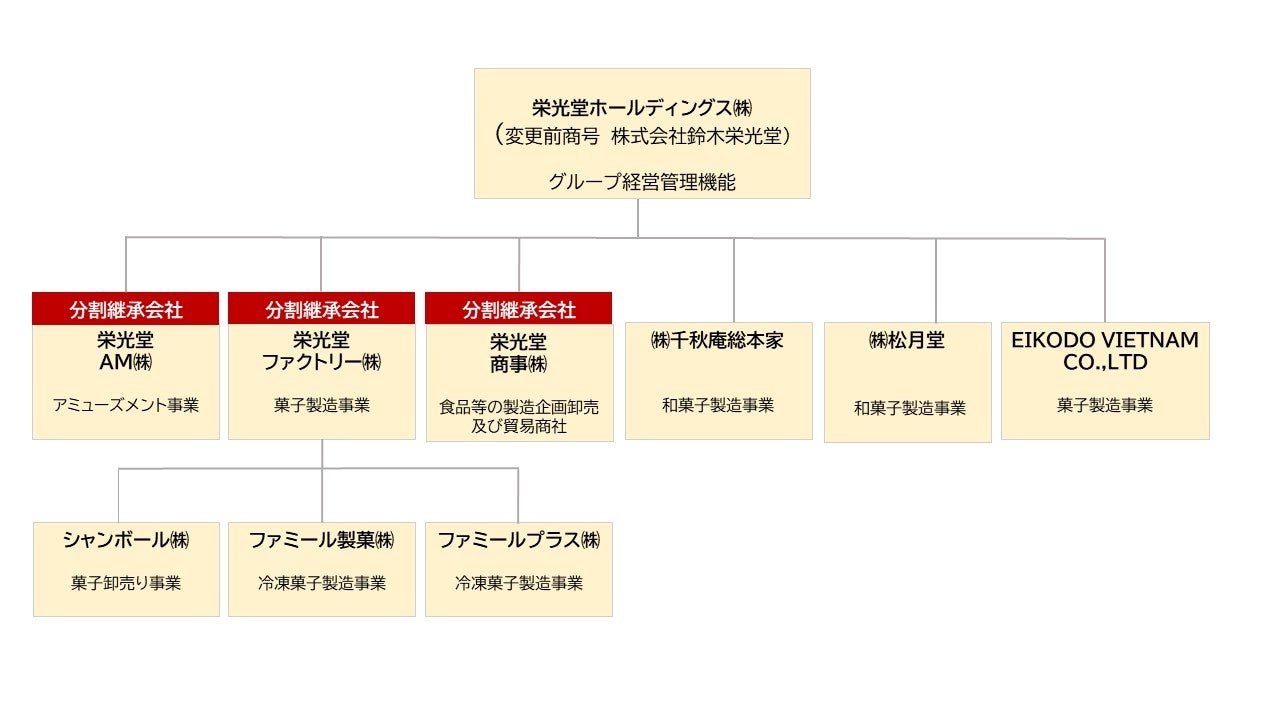 AM事業部を「栄光堂AM株式会社」に、製造事業部を「栄光堂ファクトリー株式会社」に、海外一般G事業部を「栄光堂商事株式会社」に会社分割いたします。株式会社鈴木栄光堂は同日、商号を「栄光堂ホールディングス株式会社」に変更し、グループ全体の経営管理をおこなってまいります。