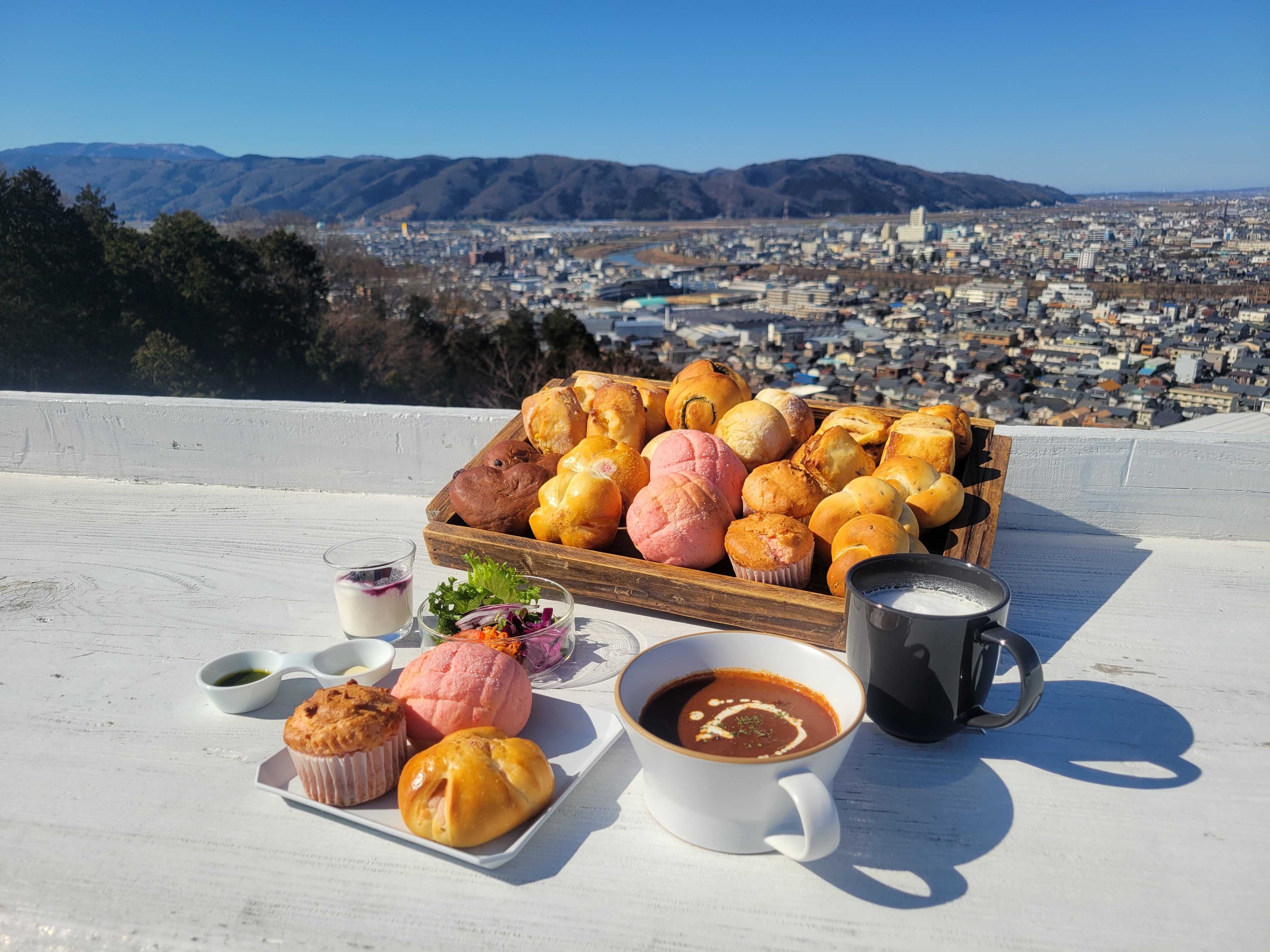 土日祝の朝限定でオープンする、店内の工房で焼き上げる自家製パンが自慢のお店です。野菜ポタージュ、フルーツグラノラヨーグルト、お好きなドリンクがセットになった、ちょっと贅沢で体に優しいモーニングセットをお楽しみいただけます。併設のスカイデッキからは市街地が一望できる絶景が広がっており、いつ来ても足羽山の四季折々の風景や空気感を体験できるので、週末のごほうびとして、旅先の思い出として、特別な朝をお楽しみください。