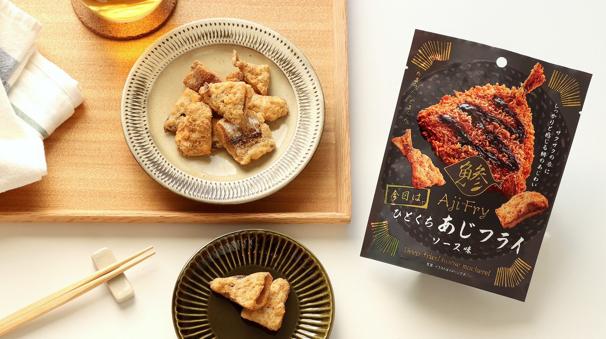 「ひとくちあじフライ」は、本来食卓に並ぶ、油で揚げる前のあじフライを、ひとくちサイズにカットし、そのままバキュームフライ製法でじっくり低温で揚げたお菓子です。あじの風味を残したサクサク食感で、あじフライによく合うこだわりのソース味に仕上げました。パッケージは見た目にもインパクトのあるデザインに仕上げました。食べてびっくりすること間違いなし!「ひとくちあじフライ」を是非ご賞味ください。